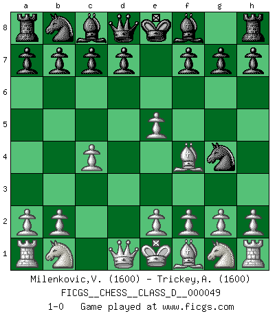 Last move : 1-0 2007 July 11 22:41:16 [Event "FICGS__CHESS__CLASS_D__000049"] [Site "FICGS"] [Date "2007.06.01"] [Round "1"] [White "Milenkovic,Vladimir"] [Black "Trickey,Andrew"] [Result "1-0"] [WhiteElo "1600"] [BlackElo "1600"] 1.d4 Nf6 2.c4 e5 3.dxe5 Ng4 4.Bf4 1-0 This chess game has been lost on time (started : 2007.06.01 11:17:28) Budapest : Rubinstein variation Player White won this chess game. Follow this game move after move (download)Only the player with the initiative has the right to attack. (Wilhelm Steinitz) Es gibt keine einzige Frau, der ich nicht einen Springer vorgeben könnte und trotzdem gewänne. (Robert James Fischer) Con el tiempo, empecé a progresar en partidas decisivas. Tal vez porque me di cuenta de una simple verdad: no solo estaba yo nervioso sino también mi oponente. (Mikhail Tal) Celui qui prend des risques peut perdre, celui qui n'en prend pas perd toujours. (Xavier Tartacover) Even the best needles are not sharp at both ends. (Chinese proverb)