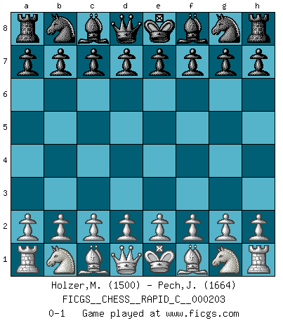 Last move : 0-1 2019 March 11 22:49:8 [Event "FICGS__CHESS__RAPID_C__000203"] [Site "FICGS"] [Date "2019.02.09"] [Round "1"] [White "Holzer,Michael"] [Black "Pech,Jaroslav senior"] [Result "0-1"] [WhiteElo "1500"] [BlackElo "1664"] 0-1 This chess game has been lost on time (started : 2019.02.09 21:22:8) Player Black won this chess game. Follow this game move after move (download)I thought the most common mistake [in chess] was the first one: Learning the game :P (Garvin Gray, FICGS forum) Ohne ihre Erfolge schmälern zu wollen würde ich sagen Petrosian, Spassky und Karpov verdanken ihre Siege ihren Trainern - Boleslavsky, Bondarevsky und Furman. (Mikhail Moiseyevich Botvinik) Tu cuerpo tiene que estar en óptima condición. Tu Ajedrez se deteriora como lo hace tu cuerpo. No puedes separar la mente y el cuerpo. (Bobby Fischer) L'action d'une oeuvre littéraire se déroule sur un champ de bataille. Les masques et les types du drame moderne correspondent aux pièces du jeu d'échecs. L'intrigue correspond aux coups et aux gambits, c'est à dire aux techniques du jeu telles qu'utilisées et interprétées par les joueurs. Les tactiques et les péripéties [mouvements] correspondent aux coups exécutés par l'adversaire. (Viktor Shklovsky) A good aphorism is too hard for the tooth of time, and is not worn away with the centuries, although it serves as food for every speech. (Friedrich Nietzsche)