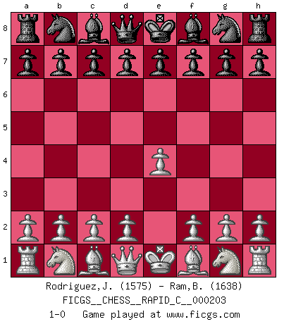 Last move : 1-0 2019 March 12 10:53:33 [Event "FICGS__CHESS__RAPID_C__000203"] [Site "FICGS"] [Date "2019.02.09"] [Round "1"] [White "Rodriguez,Juan Antonio"] [Black "Ram,Bekuff"] [Result "1-0"] [WhiteElo "1575"] [BlackElo "1638"] 1.e4 1-0 This chess game has been lost on time (started : 2019.02.09 21:22:8) King's pawn Opening Player White won this chess game. Follow this game move after move (download)You cannot play at Chess if you are kind-hearted. (French Proverb) Die Leute spielen gegen mich seit 15 Jahren unter Ihren Möglichkeiten. (Robert James Fischer) Si no le temes a Spassky, entonces elimino el elemento del dinero. (Jim Slater) Que feriez-vous si vous étiez en train de jouer aux échecs et que la fin du monde arrive ? Je continuerais à jouer. (Saint Borromée) Depression is just anger without enthusiasm. (Unknown)