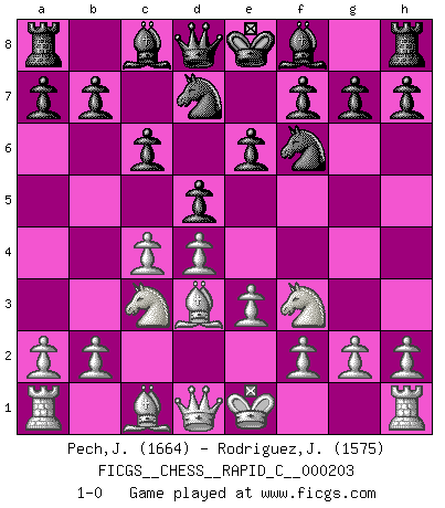 Last move : 1-0 2019 April 20 17:52:25 [Event "FICGS__CHESS__RAPID_C__000203"] [Site "FICGS"] [Date "2019.02.09"] [Round "1"] [White "Pech,Jaroslav senior"] [Black "Rodriguez,Juan Antonio"] [Result "1-0"] [WhiteElo "1664"] [BlackElo "1575"] 1.d4 d5 2.c4 c6 3.Nf3 Nf6 4.Nc3 e6 5.e3 Nbd7 6.Bd3 1-0 This chess game has been lost on time (started : 2019.02.09 21:22:8) QGD Slav : 4.Nc3 Player White won this chess game. Follow this game move after move (download)We must make sure that Chess will not be like a dead language, very interesting, but for a very small group. (Sytze Faber) Der 70jährige Viktor Kortschnoi: Die Rentenanstalt wollte mich zwingen in Rente zu gehen. Meine Frau erhält jetzt eine Pension- und ich zahle weiter in die Rentenkasse ein! (Viktor Kortschnoi) Un sacrificio se refuta mucho mejor al aceptarlo. (Wilhelm Steinitz) Demandez au pauvre Cg1 ce qu'il en pense. Eduard Gufeld à propos de la variante Saemisch de l'Est-Indienne. As a goal marker shodan is important. As a destination it is a poor place to stop. (Thomas Tamayo)