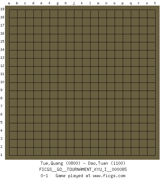 Last move : 0-1 2019 March 11 22:49:8 [Event "FICGS__GO__TOURNAMENT_KYU_I__000085"] [Site "FICGS"] [Date "2019.02.09"] [Round "1"] [Black "Tue,Quang"] [White "Dao,Tuan"] [Result "0-1"] [Rating 1 "0800"] [Rating 2 "1100"] 0-1 This go game has been lost on time (started : 2019.02.09 21:23:4) Here are the names of the openings (joseki) played in the four corners : Player White won this Go (weiqi, baduk) game. Follow this game move after move (download)You can hide nothing on the goban. (Pierre Audouard) The problem with troubleshooting is that trouble shoots back. (Anonymous)