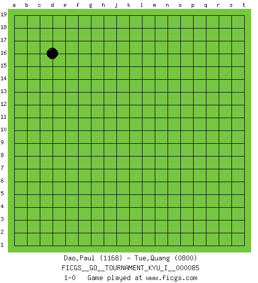 Last move : 1-0 2019 March 12 10:53:33 [Event "FICGS__GO__TOURNAMENT_KYU_I__000085"] [Site "FICGS"] [Date "2019.02.09"] [Round "1"] [Black "Dao,Paul"] [White "Tue,Quang"] [Result "1-0"] [Rating 1 "1168"] [Rating 2 "0800"] 1.d16 1-0 This go game has been lost on time (started : 2019.02.09 21:23:4) Here are the names of the openings (joseki) played in the four corners : Player Black won this Go (weiqi, baduk) game. Follow this game move after move (download)Those who are good at winning, don't usually fight. (Zhang) All the biggest technological inventions created by man - the airplane, the automobile, the computer - says little about his intelligence, but speaks volumes about his laziness. (Mark Kennedy)