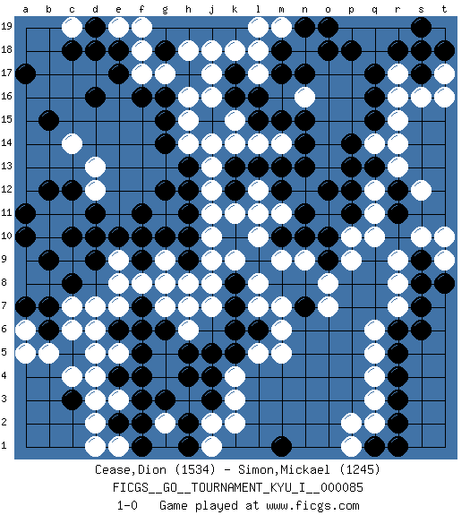 Last move : 1-0 2019 November 5 21:13:0 [Event "FICGS__GO__TOURNAMENT_KYU_I__000085"] [Site "FICGS"] [Date "2019.02.09"] [Round "1"] [Black "Cease,Dion"] [White "Simon,Mickael"] [Result "1-0"] [Rating 1 "1534"] [Rating 2 "1245"] 1.d16 d4 2.q16 q4 3.k16 c14 4.c12 d12 5.d11 d13 6.b15 c11 7.c10 b11 8.d10 b10 9.b9 r14 10.b12 n16 11.f16 r17 12.q17 r16 13.q15 r15 14.p13 q12 15.p18 k4 16.r3 q3 17.r4 q5 18.r5 q6 19.s7 r8 20.q13 r13 21.p12 q11 22.l13 h16 23.g14 h14 24.h13 j14 25.l15 j13 26.h12 j12 27.h11 l12 28.m12 l11 29.g15 j16 30.k17 j18 31.g18 h18 32.m13 k9 33.h9 m11 34.f3 e3 35.f4 d6 36.j4 k3 37.j5 j7 38.k5 l5 39.l6 m5 40.j3 j2 41.k7 j8 42.h2 k2 43.f6 g17 44.e18 f17 45.e17 f18 46.c8 l18 47.m17 n18 48.m18 m19 49.n17 k18 50.c3 c4 51.e2 d2 52.f2 d3 53.s8 r9 54.r2 q2 55.q1 p1 56.r1 p2 57.r18 s18 58.s19 e7 59.f7 e8 60.f9 e9 61.e10 m7 62.b6 c6 63.b7 b5 64.s9 s10 65.p11 p10 66.o10 p9 67.n11 n9 68.o18 m6 69.n10 m9 70.n19 l19 71.s17 e19 72.d19 f19 73.c18 t9 74.r6 r7 75.s6 q14 76.p14 s16 77.t18 h6 78.e6 f8 79.g8 c7 80.h5 e5 81.f5 g7 82.g6 h7 83.h1 j1 84.d9 d7 85.a11 l17 86.l16 l7 87.k6 t16 88.a10 t17 89.s18 j11 90.g16 j10 91.k13 f10 92.f11 g9 93.h10 h8 94.g10 k14 95.f9 l14 96.m15 m14 97.n14 e1 98.f1 d1 99.g8 h3 100.g3 g9 101.t8 t10 102.g8 g2 103.h4 g9 104.o9 o8 105.g8 c19 106.d18 g9 107.n15 f10 108.k8 l8 109.f9 n12 110.o12 f10 111.r12 s12 112.f9 g8 113.n13 f10 114.r11 q10 115.m10 l10 116.k12 k11 117.o19 j9 118.g12 k15 119.f9 a6 120.a7 a5 121.n7 o7 122.a17 j17 123.m1 h15 124.e4 d5 125.f10 1-0 Here are the names of the openings (joseki) played in the four corners : Corner d16 : d16 c14 Hoshi (Hwajeom, Seongjeom, Xingwei`) 4-4 Point. The star or hoshi (4-4) point, emphasizing influence at the potential expense of territory. Ikken Kakari (Hankan Keolch'im, Yi Gua`jiao~, 1-Space Low Approach). White 2 is the standard approach move to the 4-4. Corner d4 : d4 b9 Hoshi (Hwajeom, Seongjeom, Xingwei`) 4-4 Point. The star or hoshi (4-4) point, emphasizing influence at the potential expense of territory. Corner q16 : q16 r14 Hoshi (Hwajeom, Seongjeom, Xingwei`) 4-4 Point. The star or hoshi (4-4) point, emphasizing influence at the potential expense of territory. Ikken Kakari (Hankan Keolch'im, Yi Gua`jiao~, 1-Space Low Approach). White 2 is the standard approach move to the 4-4. Corner q4 : q4 r3 Hoshi (Hwajeom, Seongjeom, Xingwei`) 4-4 Point. The star or hoshi (4-4) point, emphasizing influence at the potential expense of territory. Player Black won this Go (weiqi, baduk) game. Follow this game move after move (download)Everything would seem to be possible in Go. Like pulling a rabbit, by a magical move, out of a hat. (Pierre Audouard) It's not a bug - it's an undocumented feature. (Anonymous)