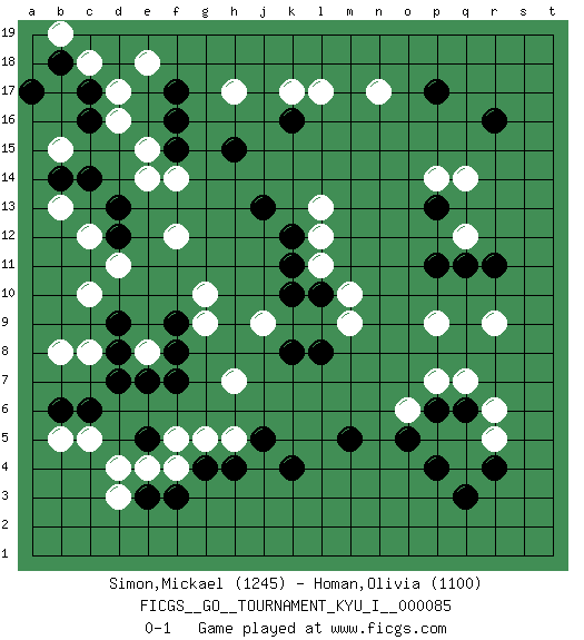 Last move : 0-1 2019 April 4 23:33:25 [Event "FICGS__GO__TOURNAMENT_KYU_I__000085 "] [Site "FICGS"] [Date "2019.02.09"] [Round "1"] [Black "Simon,Mickael "] [White "Homan,Olivia "] [Result "0-1"] [Rating 1 "1245"] [Rating 2 "1100"] 1.r16 d16 2.q3 d4 3.p17 r6 4.r4 r9 5.r11 p9 6.p11 k17 7.k4 n17 8.c14 c12 9.d12 d11 10.d13 c10 11.f16 e15 12.f15 e14 13.c17 d17 14.c16 f14 15.h15 f12 16.k16 l17 17.j13 h17 18.f17 c18 19.b18 e18 20.f3 b19 21.a17 b13 22.b14 b15 23.d7 f4 24.g4 f5 25.e3 d3 26.c6 b5 27.b6 c5 28.f7 g5 29.h4 e8 30.e7 h5 31.j5 h7 32.f8 g9 33.f9 g10 34.d9 c8 35.d8 b8 36.e5 e4 37.p6 p7 38.m5 o6 39.q6 q7 40.o5 r5 41.p4 l13 42.k12 l12 43.k11 l11 44.k10 m9 45.l8 j9 46.l10 m10 47.k8 q12 48.q11 q14 49.p13 p14 0-1 Here are the names of the openings (joseki) played in the four corners : Corner q4 : q3 r6Komoku (Somok, Xiao~mu`) 3-4 Point. The komoku (3-4) point is the traditional corner enclosure move..Niken Kakari (Dukan Keolch'im, E`r Gua`jiao~, 2-Space Low Approach). White 2 is used with friendly forces backing it up. Its purpose is to prevent a pincer. Locally it results in a loss, but may be appropriate fuseki strategy. It was popular in the late 1950s and early 1960s, but is not seen often nowadays, having been replaced by the one-space high approach, with which it has points in common. Corner d16 : d16 c14Hoshi (Hwajeom, Seongjeom, Xingwei`) 4-4 Point. The star or hoshi (4-4) point, emphasizing influence at the potential expense of territory.Ikken Kakari (Hankan Keolch'im, Yi Gua`jiao~, 1-Space Low Approach). Black 2 is the standard approach move to the 4-4. Corner d4 : d4 f3Hoshi (Hwajeom, Seongjeom, Xingwei`) 4-4 Point. The star or hoshi (4-4) point, emphasizing influence at the potential expense of territory.Ikken Kakari (Hankan Keolch'im, Yi Gua`jiao~, 1-Space Low Approach). Black 2 is the standard approach move to the 4-4. Player White won this Go (weiqi, baduk) game.Follow this game move after move (download ) If you cannot succeed, then die gloriously. (Chinese proverb) Secret operations are essential in war; upon them the army relies to make its every move. (Sun Tzu)