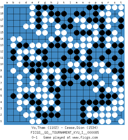 Last move : 0-1 2019 August 19 17:58:30 [Event "FICGS__GO__TOURNAMENT_KYU_I__000085"] [Site "FICGS"] [Date "2019.02.09"] [Round "1"] [Black "Vo,Tham"] [White "Cease,Dion"] [Result "0-1"] [Rating 1 "1102"] [Rating 2 "1534"] 1.q16 d4 2.q4 d16 3.f17 c14 4.k16 r14 5.r12 r17 6.q17 r16 7.q15 r18 8.q14 r13 9.q13 s12 10.s11 r3 11.r4 q3 12.p4 o2 13.n4 q18 14.p18 o18 15.p19 h17 16.h16 j16 17.j17 j15 18.h15 k17 19.j18 h14 20.l17 g16 21.h18 g15 22.s13 s14 23.t12 c7 24.f3 e2 25.n2 o3 26.n3 s4 27.s5 s3 28.o4 s6 29.r5 t5 30.r7 f5 31.c9 c11 32.d7 c6 33.d5 d6 34.d3 e3 35.e4 c4 36.e5 e6 37.f4 c3 38.f2 d2 39.g5 g7 40.c13 b13 41.b12 c12 42.d13 b14 43.b11 e11 44.o1 p2 45.t4 t3 46.s1 s2 47.p1 q1 48.n1 q2 49.r1 t1 50.t2 j7 51.k9 h9 52.k11 l14 53.b5 c5 54.l7 n12 55.g10 e12 56.h10 m13 57.d11 d12 58.f9 f6 59.e10 h4 60.h3 d9 61.d10 c10 62.d8 j3 63.j4 h5 64.h2 t1 65.o17 b9 66.t2 r2 67.e9 s15 68.h6 g4 69.j5 g6 70.h7 e18 71.o11 l10 72.m11 n11 73.n10 s7 74.r8 g8 75.j6 g17 76.m12 c8 77.g12 n14 78.o12 s8 79.s9 j9 80.j10 j8 81.k7 n17 82.n18 n16 83.o19 f13 84.p3 t1 85.s1 r1 86.f18 g18 87.g19 e19 88.f19 e17 89.f16 f15 90.k18 e16 91.h19 n13 92.k13 k14 93.j13 g5 94.j14 k15 95.l16 d9 96.j2 l13 97.l12 f11 98.h8 g9 99.f10 g13 100.g11 t14 101.q19 r19 102.t16 t18 103.s18 s17 104.t17 s19 105.k8 e8 106.c9 g3 107.g2 d9 108.f8 e7 109.h13 t6 110.t8 r6 111.q6 o16 112.m15 o13 113.p13 p16 114.p17 m17 115.m18 f1 116.g1 e1 117.t13 p15 118.n15 o14 119.o15 p14 120.r15 q7 121.q8 r9 122.t9 t19 123.t7 t4 124.f12 s10 125.r10 q9 126.t10 p8 127.o7 e13 128.p7 n9 129.o9 q10 130.q11 p10 131.o10 p6 132.q5 o8 133.n7 n8 134.m8 m9 135.l9 m10 0-1 Here are the names of the openings (joseki) played in the four corners : Corner d16 : d16 f17 Hoshi (Hwajeom, Seongjeom, Xingwei`) 4-4 Point. The star or hoshi (4-4) point, emphasizing influence at the potential expense of territory. Ikken Kakari (Hankan Keolch'im, Yi Gua`jiao~, 1-Space Low Approach). Black 2 is the standard approach move to the 4-4. Corner q16 : q16 r14 Hoshi (Hwajeom, Seongjeom, Xingwei`) 4-4 Point. The star or hoshi (4-4) point, emphasizing influence at the potential expense of territory. Ikken Kakari (Hankan Keolch'im, Yi Gua`jiao~, 1-Space Low Approach). White 2 is the standard approach move to the 4-4. Corner q4 : q4 r3 Hoshi (Hwajeom, Seongjeom, Xingwei`) 4-4 Point. The star or hoshi (4-4) point, emphasizing influence at the potential expense of territory. Player White won this Go (weiqi, baduk) game. Follow this game move after move (download)If you have won four corners, resign. (Anonymous) Work expands to fill the time available. (C. Northcote Parkinson, in Parkinson's Laws)