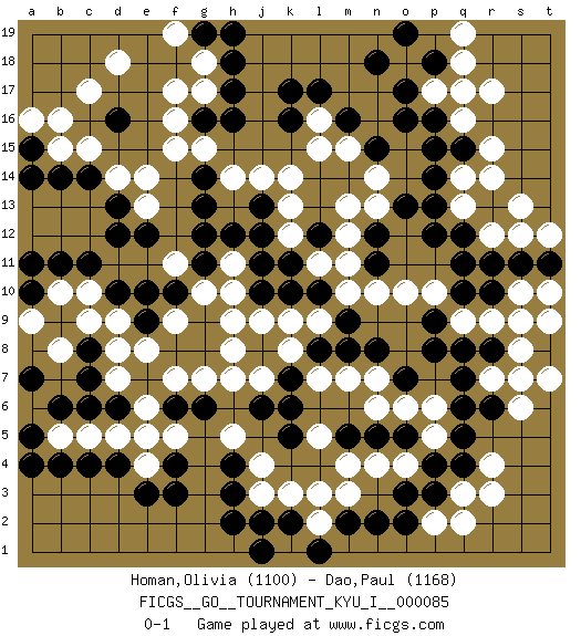 Last move : 0-1 2019 March 4 1:31:1 [Event "FICGS__GO__TOURNAMENT_KYU_I__000085"] [Site "FICGS"] [Date "2019.02.09"] [Round "1"] [Black "Homan,Olivia"] [White "Dao,Paul"] [Result "0-1"] [Rating 1 "1100"] [Rating 2 "1168"] 1.d16 q16 2.d4 q3 3.f3 r9 4.c14 f17 5.o17 d18 6.o16 p17 7.h17 q14 8.l17 f15 9.c11 c17 10.q5 m4 11.p8 r4 12.q10 o4 13.p9 q9 14.q11 p10 15.p12 o10 16.s11 r12 17.q7 s6 18.r13 s8 19.q12 q13 20.m8 s13 21.n5 m10 22.o13 n4 23.k7 k9 24.n11 h9 25.k5 n10 26.g8 k3 27.b4 b5 28.d10 c10 29.b11 c9 30.e10 d9 31.c4 c5 32.j10 d5 33.l10 j9 34.m9 l9 35.k10 l11 36.k11 h11 37.l12 k12 38.j12 m11 39.j11 k13 40.j13 m13 41.p15 k14 42.g13 j14 43.g11 h14 44.j6 j7 45.l8 l7 46.k6 k8 47.n8 m7 48.o7 n7 49.f6 h7 50.h12 h10 51.g9 f9 52.f10 g10 53.g12 f11 54.e9 g7 55.f8 e8 56.m5 f7 57.n12 h8 58.g16 m12 59.k16 f16 60.p14 n14 61.n18 o18 62.p18 l15 63.o19 q18 64.j2 j3 65.h2 r17 66.b14 b15 67.e12 c15 68.k2 f9 69.m2 l2 70.l1 l3 71.o5 k1 72.j1 o6 73.q6 p6 74.p4 p5 75.q4 n6 76.p3 l5 77.s7 r3 78.o2 r7 79.h3 h5 80.e3 e4 81.a5 f5 82.a4 a6 83.d13 d14 84.h4 q2 85.f4 j4 86.q15 e5 87.a15 r15 88.b6 b16 89.h18 g18 90.c6 e14 91.p16 d7 92.q8 q17 93.r11 s10 94.t11 s12 95.r6 t12 96.m16 t7 97.r8 s7 98.n15 m15 99.k17 l16 100.d12 e13 101.o3 p2 102.g14 g17 103.h16 g15 104.a7 b8 105.a14 a16 106.n2 m3 107.a10 b10 108.a11 a9 109.c7 n13 110.p13 t10 111.g19 r14 112.h19 f19 113.s9 q19 114.c8 t9 115.d6 d8 116.r10 e6 117.g6 s9 0-1 Here are the names of the openings (joseki) played in the four corners : Corner q16 : q16 o17 Hoshi (Hwajeom, Seongjeom, Xingwei`) 4-4 Point. The star or hoshi (4-4) point, emphasizing influence at the potential expense of territory. Ikken Kakari (Hankan Keolch'im, Yi Gua`jiao~, 1-Space Low Approach). Black 2 is the standard approach move to the 4-4. Player White won this Go (weiqi, baduk) game. Follow this game move after move (download)Take the cutting stone on the second line. (Anonymous) Over-the-board chess is the favorite of mortals, correspondence chess is the favorite of the gods. (Eduard Dyckhoff)