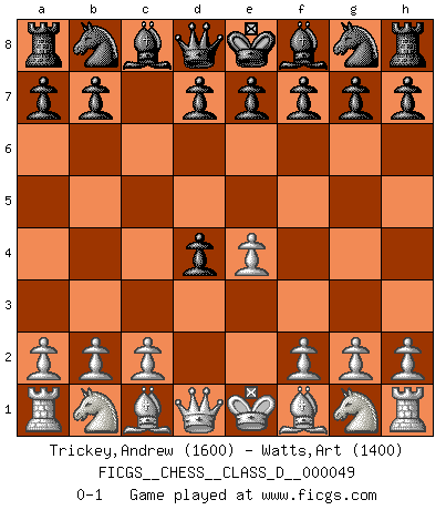 Last move : 0-1 2007 July 12 10:43:50 [Event "FICGS__CHESS__CLASS_D__000049"] [Site "FICGS"] [Date "2007.06.01"] [Round "1"] [White "Trickey,Andrew"] [Black "Watts,Art"] [Result "0-1"] [WhiteElo "1600"] [BlackElo "1400"] 1.e4 c5 2.d4 cxd4 0-1 This chess game has been lost on time (started : 2007.06.01 11:17:28) Sicilian : Smith-Morra gambit Player Black won this chess game. Follow this game move after move (download)Chess is like life. (Boris Spassky) Schach ist ein Teil der Kultur, und wenn es mit der Kultur abwärts geht, geht es auch mit dem Schach abwärts. (Mikhail Moiseyevich Botvinik) Si tu oponente te ofrece un empate, trata de averiguar porque piensa él que esta en una posición peor. (Nigel Short) J'ai toujours senti une vague pitié pour l'homme qui ne connaît rien aux échecs, tout comme j'en aurais pour un homme ignorant de l'amour. Les Echecs, comme la musique ou comme l'amour, ont le pouvoir de rendre heureux. (Siegbert Tarrasch) All politicians must be presumed guilty until they are proven innocent. (Dinesh De Silva)