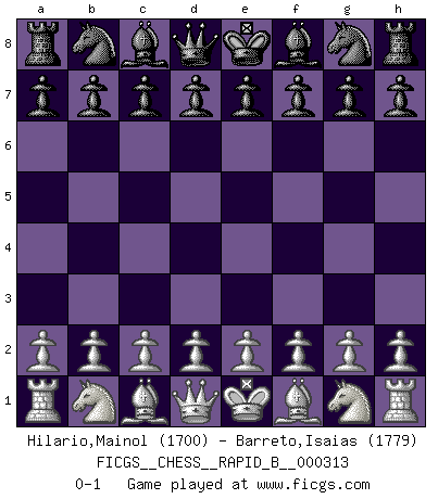 Last move : 0-1 2019 March 12 10:53:33 [Event "FICGS__CHESS__RAPID_B__000313"] [Site "FICGS"] [Date "2019.02.09"] [Round "1"] [White "Hilario,Mainol"] [Black "Barreto,Isaias"] [Result "0-1"] [WhiteElo "1700"] [BlackElo "1779"] 0-1 This chess game has been lost on time (started : 2019.02.09 23:51:44) Player Black won this chess game. Follow this game move after move (download)By playing at Chess then, we may learn: First: Foresight... Second: Circumspection... Third: Caution... And lastly, we learn by Chess the habit of not being discouraged by present bad appearances in the state of our affairs, the habit of hoping for a favorable chance, and that of persevering in the secrets of resources. (Benjamin Franklin) Es ist besser die Steine des Gegners zu opfern. (Savielly Grigorievitsch Tartakower) No hay precio que sea tan grande por la cabellera del Rey enemigo. (Koblentz) Fischer est le meilleur joueur du monde et Karpov n'est qu'un joueur de bistrot. (Garry Kasparov, agé de 16 ans) In my experience, there's no such thing as luck. (Obi-Wan Kenobi in Star Wars ep.4)