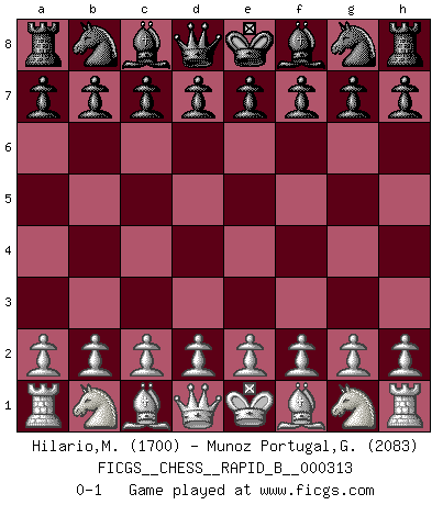 Last move : 0-1 2019 March 12 10:53:33 [Event "FICGS__CHESS__RAPID_B__000313"] [Site "FICGS"] [Date "2019.02.09"] [Round "1"] [White "Hilario,Mainol"] [Black "Munoz Portugal,Guillermo"] [Result "0-1"] [WhiteElo "1700"] [BlackElo "2083"] 0-1 This chess game has been lost on time (started : 2019.02.09 23:51:44) Player Black won this chess game. Follow this game move after move (download)When you are lonely, when you feel yourself an alien in the world, play Chess. This will raise your spirits and be your counselor in war. (Aristotle) Wie bekannt hörte Morphy 1859 auf, Schach zu spielen. Seine Enttäuschung galt nicht so sehr dem Schach, wie den Schachspielern. (Robert James Fischer) El Ajedrez es tan interesante por sí solo, que no es necesario un interés monetario para persuadir a una persona a que lo practique; por lo tanto, nunca se juega por dinero. (Benjamin Franklin) On peut tirer plus d'utilité d'une partie perdue que de 100 parties gagnées. (Capablanca) There are two major products that came out of Berkeley: LSD and UNIX. We do not believe this is to be a coincidence. (Jeremy S. Anderson)