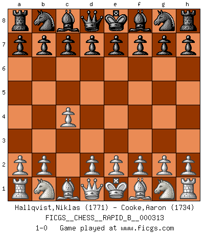 Last move : 1-0 2019 March 12 10:53:33 [Event "FICGS__CHESS__RAPID_B__000313"] [Site "FICGS"] [Date "2019.02.09"] [Round "1"] [White "Hallqvist,Niklas"] [Black "Cooke,Aaron"] [Result "1-0"] [WhiteElo "1771"] [BlackElo "1734"] 1.c4 1-0 This chess game has been lost on time (started : 2019.02.09 23:51:44) English Opening Player White won this chess game. Follow this game move after move (download)There is no remorse like the remorse of Chess. (H. G. Wells) Ich kämpfe solange mein Gegner einen Fehler machen kann. (Emanuel Lasker) Bobby Fischer es el jugador de Ajedrez mas grande que jamás haya existido. (Ken Smith) Il n'y a pas de prix trop élevé au scalp de l'ennemi. (Koblentz) I find your interest interesting. (Gregory House, House M.D.)
