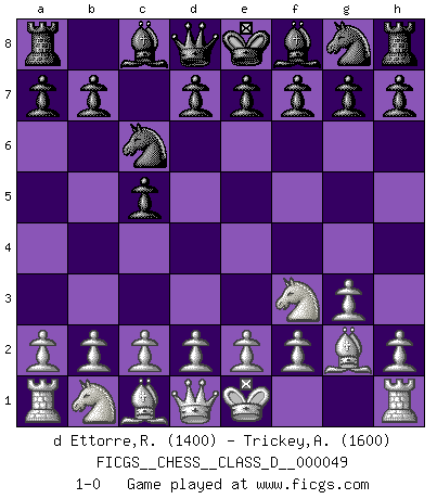 Last move : 1-0 2007 July 12 10:43:50 [Event "FICGS__CHESS__CLASS_D__000049"] [Site "FICGS"] [Date "2007.06.01"] [Round "1"] [White "d Ettorre,Rodolfo"] [Black "Trickey,Andrew"] [Result "1-0"] [WhiteElo "1400"] [BlackElo "1600"] 1.Nf3 c5 2.g3 Nc6 3.Bg2 1-0 This chess game has been lost on time (started : 2007.06.01 11:17:28) Reti Opening Player White won this chess game. Follow this game move after move (download)By this measure (on the gap between Fischer & his contemporaries), I consider him the greatest world champion. (Garry Kasparov) Ich verstehe Aljechins Kombinationen ganz gut; aber woher er diese Angriffschancen bekommt und wie er die Eröffnung behandelt das ist für mich ein Buch mit sieben Siegeln. (Rudolf Spielmann) Evita las multitudes. Haz independientemente tu propio razonamiento. Trata de ser el jugador de Ajedrez, no la pieza de Ajedrez. (Ralph Charell) Toute estimation doit être constamment réévaluée. (Jacob Estrin) Tree pose grows confidence. It roots me to this world. (Terri Guillemets)