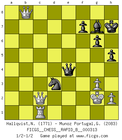 Last move : 1/2-1/2 2019 May 11 14:5:45 [Event "FICGS__CHESS__RAPID_B__000313"] [Site "FICGS"] [Date "2019.02.09"] [Round "1"] [White "Hallqvist,Niklas"] [Black "Munoz Portugal,Guillermo"] [Result "1/2-1/2"] [WhiteElo "1771"] [BlackElo "2083"] 1.c4 c5 2.g3 g6 3.Bg2 Bg7 4.Nc3 Nc6 5.e3 e6 6.Nge2 Nge7 7.O-O O-O 8.b3 d5 9.Rb1 b6 10.Bb2 d4 11.exd4 cxd4 12.Nb5 Rb8 13.Ba3 Bb7 14.Nf4 Ba8 15.Nd3 a6 16.Nd6 b5 17.Ne4 b4 18.Bb2 Ne5 19.Ndc5 a5 20.f4 Nd7 21.Nd3 Qb6 22.Qe2 a4 23.a3 Nc6 24.bxa4 b3 25.c5 Qa6 26.Rfc1 Rfd8 27.Qf1 Qxa4 28.Nd6 Qa5 29.Qe2 Qc7 30.Ra1 Na5 31.a4 Bc6 32.Qf2 h6 33.Bf3 h5 34.Qg2 Bxf3 35.Qxf3 Ra8 36.Kg2 Nc6 37.Ra3 Rdb8 38.Nf2 Nf6 39.Nb5 Qd7 40.Qxb3 e5 41.fxe5 Nxe5 42.Bxd4 Rxb5 43.axb5 Rxa3 44.Qxa3 Qxd4 45.c6 Neg4 46.Qc5 Qxd2 47.c7 Nd5 48.c8Q+ Kh7 49.b6 Nde3+ 50.Qxe3 Nxe3+ 51.Kf3 Ng4 52.Qc2 Qe3+ 53.Kg2 Nxf2 54.b7 Nd3 55.b8Q Qe4+ 1/2-1/2 English : Symmetrical variation Kingside Castling by player White (move 7) Kingside Castling by player Black (move 7) Promotion Queen by player White (move 48) Promotion Queen by player White (move 55) This chess game ended in a draw. Follow this game move after move (download)In Chess, just as in life, today's bliss may be tomorrow's poison. (Assaic) Mit sehr nachdenklichem Gesicht schreitet Bobby durch den Turniersaal. Was ist passiert?, fragt Lombardy. Ich stehe schlecht, antwortet Fischer. Lombardy: Dann biete doch einfach Remis an. Fischer: So schlecht stehe ich nun auch wieder nicht! (Robert James Fischer) El Ajedrez es la vida. (Bobby Fischer) Les Echecs ont trois composantes : le temps, l'espace et le matériel en dernier. (Mikhail Tal) No, no, you're not thinking; you're just being logical. (Niels Bohr)