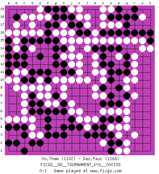 Last move : 0-1 2019 February 22 1:34:26 [Event "FICGS__GO__TOURNAMENT_KYU__000193"] [Site "FICGS"] [Date "2019.02.12"] [Round "1"] [Black "Vo,Tham"] [White "Dao,Paul"] [Result "0-1"] [Rating 1 "1102"] [Rating 2 "1168"] 1.r16 q4 2.p16 d16 3.c3 d4 4.c4 d5 5.e2 c5 6.f4 c9 7.f17 d14 8.k16 r10 9.o3 q6 10.k4 r13 11.f15 n17 12.q18 k18 13.k17 l18 14.j18 n15 15.q11 r11 16.q13 l15 17.q12 r12 18.l13 k15 19.h16 h15 20.g15 j15 21.h12 j16 22.j17 h17 23.h18 g16 24.f16 h13 25.g13 j12 26.g12 k13 27.j11 k11 28.c12 d18 29.c17 d17 30.c15 c16 31.d15 b15 32.c14 b14 33.c13 j10 34.h11 k10 35.l12 k12 36.o5 q2 37.p2 m5 38.m3 h5 39.h4 g4 40.g3 g5 41.h3 l4 42.l3 k5 43.j5 j6 44.j4 k6 45.f5 g7 46.f6 d3 47.d2 b3 48.b4 b5 49.b2 o6 50.n5 n6 51.p9 q9 52.o10 q10 53.p11 p3 54.o2 r3 55.d7 c7 56.d8 b10 57.d10 c8 58.g9 d9 59.e9 e10 60.f10 e8 61.e7 f9 62.e11 g10 63.e9 r15 64.s16 e10 65.f11 h9 66.f8 e9 67.g8 f7 68.h6 h8 69.g6 p15 70.o12 n11 71.m10 m11 72.l11 l10 73.o14 o15 74.m14 n10 75.n9 m9 76.o8 n8 77.p7 p6 78.p14 q15 79.n7 m8 80.n14 m12 81.n12 m13 82.n13 p13 83.q8 r8 84.o7 q7 85.o18 s15 86.t15 t14 87.t16 s14 88.q16 n18 89.m4 l5 90.d6 c6 91.e6 o17 92.p18 f18 93.g17 h16 94.g18 e18 95.b13 p17 96.q17 o4 97.n4 p4 98.a14 b16 99.c10 c11 100.d11 b11 101.h7 j7 102.h14 j14 103.j13 a5 104.a4 h13 105.g14 e3 106.f3 l17 107.l16 m16 108.o16 o19 109.p19 n19 110.n16 m15 111.p5 q5 112.b12 p1 113.o1 q1 114.a11 b9 115.f19 e19 116.g19 e16 117.e15 j19 118.a15 a16 119.a13 a10 120.a12 h10 121.h19 k19 122.j13 c2 123.c1 h13 124.o11 l14 125.j13 a3 126.a2 h13 127.g8 f8 128.j13 n2 129.n3 h13 130.b18 c18 131.j13 s18 132.r19 h13 133.e13 j13 134.r18 b17 0-1 Here are the names of the openings (joseki) played in the four corners : Corner d4 : c3 d4 San-San (Sam-Sam, San-San) 3-3 Point. The San-San (3-3) point, emphasizing territory at the expense of influence. Kata-tsuki (shoulder hit). The shoulder-hit is the traditional answer to the 3-3. The direction of Black 3 depends on the positions on the side. Crawling once may be the premise for a follow-up move of sliding with a knight's move in the opposite direction. If Black plays 3 at 3-4 (to the right), the follow-on knight's move is then played at the top (e.g. 3-4, 4-5, 5-2). Black's knight's move reduces territory potential on the side it is played. Corner d16 : d16 f17 Hoshi (Hwajeom, Seongjeom, Xingwei`) 4-4 Point. The star or hoshi (4-4) point, emphasizing influence at the potential expense of territory. Ikken Kakari (Hankan Keolch'im, Yi Gua`jiao~, 1-Space Low Approach). Black 2 is the standard approach move to the 4-4. Corner q4 : q4 o3 Hoshi (Hwajeom, Seongjeom, Xingwei`) 4-4 Point. The star or hoshi (4-4) point, emphasizing influence at the potential expense of territory. Ikken Kakari (Hankan Keolch'im, Yi Gua`jiao~, 1-Space Low Approach). Black 2 is the standard approach move to the 4-4. Player White won this Go (weiqi, baduk) game. Follow this game move after move (download)Five liberties for tactical stability. (Anonymous) Tree pose grows confidence. It roots me to this world. (Terri Guillemets)