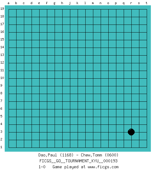 Last move : 1-0 2019 March 15 11:11:13 [Event "FICGS__GO__TOURNAMENT_KYU__000193"] [Site "FICGS"] [Date "2019.02.12"] [Round "1"] [Black "Dao,Paul"] [White "Chew,Tomm"] [Result "1-0"] [Rating 1 "1168"] [Rating 2 "0600"] 1.r3 1-0 This go game has been lost on time (started : 2019.02.12 21:38:52) Here are the names of the openings (joseki) played in the four corners : Corner q4 : r3 1-0 San-San (Sam-Sam, San-San) 3-3 Point. The San-San (3-3) point, emphasizing territory at the expense of influence. Player Black won this Go (weiqi, baduk) game. Follow this game move after move (download)You don't have to be really good anymore to get good results. What's happening with chess is that it's gradually losing its place as the par excellence of intellectual activity. Smart people in search of a challenging board game might try a game called Go. (Hans Berliner, The New York Times, 2003) History is a gallery of pictures in which there are few originals and many copies. (Alexis de Tocqueville)