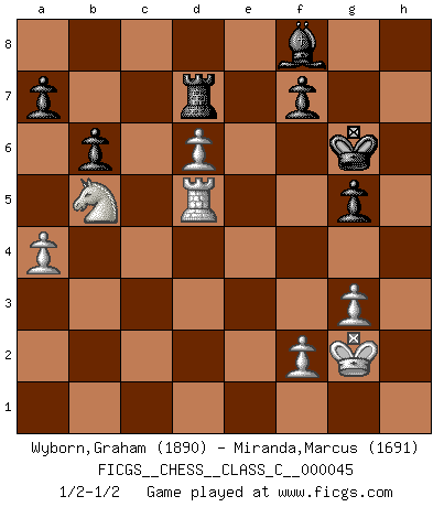 Last move : 1/2-1/2 2007 November 28 8:22:2 [Event "FICGS__CHESS__CLASS_C__000045"] [Site "FICGS"] [Date "2007.06.03"] [Round "1"] [White "Wyborn,Graham"] [Black "Miranda,Marcus"] [Result "1/2-1/2"] [WhiteElo "1890"] [BlackElo "1691"] 1.d4 Nf6 2.c4 e6 3.Nf3 b6 4.a3 Bb7 5.Nc3 d5 6.cxd5 Nxd5 7.Qc2 Nxc3 8.bxc3 Be7 9.e4 O-O 10.Bd3 c5 11.O-O Qc8 12.Qe2 Ba6 13.Re1 cxd4 14.cxd4 Bxd3 15.Qxd3 Rd8 16.Bb2 Nd7 17.Rad1 Qb7 18.Qe3 Nf6 19.d5 exd5 20.Bxf6 Bxf6 21.exd5 Qd7 22.d6 Re8 23.Qd2 Rxe1+ 24.Rxe1 Rd8 25.Rd1 g6 26.h4 Kg7 27.Qd5 Qe6 28.Qd3 Rd7 29.g3 h6 30.Nd4 Qd5 31.Nb5 Qxd3 32.Rxd3 g5 33.hxg5 hxg5 34.Rd5 Kg6 35.a4 Bg7 36.Kg2 Bf8 1/2-1/2 Queen's Indian : Petrosian system Kingside Castling by player Black (move 9) Kingside Castling by player White (move 11) This chess game ended in a draw. Follow this game move after move (download)Chess teaches you to control the initial excitement you feel when you see something that looks good and it trains you to think objectively when you're in trouble. (Stanley Kubrick) Weshalb minderdergeübte Spieler mit g2-g4 beginnen? Die betreffenden sind unschlüssig, ob sie nun rechts (h4) oder links (f4) beginnen sollen, und in ihrer Ratlosigkeit entschliessen sie sich nach guter Bürgerart dazu, den goldenen Mittelweg zu wählen. (Aaron Nimzowitsch) Del Ajedrez se ha dicho que la vida no es lo suficientemente larga para él, pero eso es culpa de la vida, no del Ajedrez. (William Ewart Napier) Aucun coup ne doit être joué sans but. (Pedro Damiano) All maxims have their antagonist maxims; proverbs should be sold in pairs, a single one being but a half truth. (William Mathews)