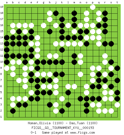 Last move : 0-1 2019 February 22 0:59:11 [Event "FICGS__GO__TOURNAMENT_KYU__000193"] [Site "FICGS"] [Date "2019.02.12"] [Round "1"] [Black "Homan,Olivia"] [White "Dao,Tuan"] [Result "0-1"] [Rating 1 "1100"] [Rating 2 "1100"] 1.q16 r4 2.d3 c16 3.p4 p3 4.o3 q3 5.n4 o5 6.o4 r6 7.c9 k4 8.h3 j5 9.h5 h6 10.g5 j6 11.k2 d8 12.c8 d6 13.c14 e16 14.f7 f8 15.g7 c7 16.d11 d9 17.d10 c4 18.c3 d4 19.e4 e5 20.f4 j3 21.e7 d7 22.f9 g8 23.e8 e9 24.f10 h8 25.f5 e10 26.e11 f11 27.g10 f12 28.j10 c12 29.b11 b12 30.d13 h11 31.h10 d12 32.e12 e13 33.c11 j11 34.k10 b10 35.a11 b8 36.b13 c10 37.a10 b9 38.e14 f13 39.c13 f14 40.k8 m6 41.p6 j2 42.l3 o6 43.q4 r5 44.q6 n8 45.h7 p9 46.q8 b15 47.c15 d15 48.a14 b16 49.b14 p8 50.r7 p7 51.q7 q9 52.o2 q2 53.s6 s5 54.r9 r10 55.s10 s9 56.s8 r8 57.s3 s2 58.r9 j7 59.j8 r8 60.l5 l6 61.r9 g6 62.f6 r8 63.t4 t6 64.r9 a9 65.a12 r8 66.r3 s4 67.r9 r11 68.k17 o17 69.p17 o16 70.r15 h17 71.m17 m15 72.k15 o18 73.p18 m13 74.h15 l16 75.k16 g16 76.k12 k13 77.l14 l13 78.n15 p16 79.m14 q17 80.r17 q18 81.r18 p19 82.m18 o14 83.n14 q14 84.s13 r8 85.t7 r2 86.r9 q15 87.r16 r8 88.t5 t3 89.r9 n13 90.j18 h18 91.m10 n10 92.o15 p15 93.o13 p14 94.r13 q13 95.m11 n11 96.e15 d16 97.d14 n16 98.k14 j13 99.m16 r8 100.t9 b3 101.b2 b4 102.a13 j16 0-1 Here are the names of the openings (joseki) played in the four corners : Corner q4 : r4 p4 Komoku (Somok, Xiao~mu`) 3-4 Point. The komoku (3-4) point is the traditional corner enclosure move.. Ikken Takagakari (Hankan Nop'dakeolch'im, Yi Gaogua`jiao~, 1-Space High Approach). The 5-4 approach move has become more popular in modern times, as modern Go emphasizes speed and influence. Corner d16 : c16 c14 Komoku (Somok, Xiao~mu`) 3-4 Point. The komoku (3-4) point is the traditional corner enclosure move.. Corner q16 : q16 r11 Hoshi (Hwajeom, Seongjeom, Xingwei`) 4-4 Point. The star or hoshi (4-4) point, emphasizing influence at the potential expense of territory. Player White won this Go (weiqi, baduk) game. Follow this game move after move (download)Dead group ? Always win ko fights ! (Anonymous) Never was anything great achieved without danger. (Niccolo Machiavelli)