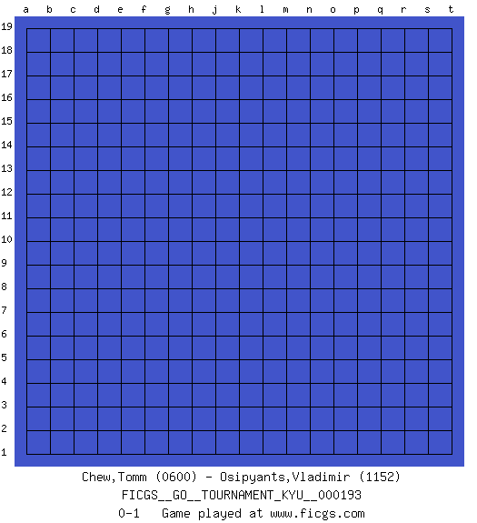 Last move : 0-1 2019 March 14 23:8:57 [Event "FICGS__GO__TOURNAMENT_KYU__000193"] [Site "FICGS"] [Date "2019.02.12"] [Round "1"] [Black "Chew,Tomm"] [White "Osipyants,Vladimir"] [Result "0-1"] [Rating 1 "0600"] [Rating 2 "1152"] 0-1 This go game has been lost on time (started : 2019.02.12 21:38:52) Here are the names of the openings (joseki) played in the four corners : Player White won this Go (weiqi, baduk) game. Follow this game move after move (download)Nothing requires doing this or that, but necessity exists. (Pierre Audouard) If computers get too powerful, we can organize them into committees. That'll do them in. (Anonymous)