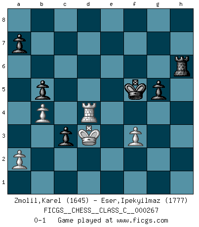 Last move : 0-1 2019 August 1 8:39:49 [Event "FICGS__CHESS__CLASS_C__000267"] [Site "FICGS"] [Date "2019.02.14"] [Round "1"] [White "Zmolil,Karel"] [Black "Eser,Ipekyilmaz"] [Result "0-1"] [WhiteElo "1645"] [BlackElo "1777"] 1.e4 f6 2.Nf3 e6 3.Nh4 f5 4.Qh5+ g6 5.Nxg6 Nf6 6.Qh3 hxg6 7.Qxh8 Nxe4 8.d3 Ng5 9.h4 Nf7 10.Qd4 Nc6 11.Qe3 e5 12.Nc3 Bb4 13.Bd2 Bxc3 14.Bxc3 d6 15.O-O-O f4 16.Qf3 Bd7 17.d4 Qf6 18.d5 Ne7 19.g3 c6 20.Qxf4 Qxf4+ 21.gxf4 Nxd5 22.Bd2 Nxf4 23.Re1 Nh5 24.Rg1 Bf5 25.Be2 Kd7 26.Bg4 Rh8 27.Rg2 Ke7 28.f3 Nf6 29.Bg5 Ke6 30.Bxf6 Kxf6 31.Rh1 d5 32.Rf2 Nd6 33.b3 b6 34.c3 c5 35.Kd2 d4 36.cxd4 exd4 37.Rg2 c4 38.Bxf5 c3+ 39.Kd3 Nxf5 40.Rg4 b5 41.b4 Re8 42.Re4 Ra8 43.h5 Rh8 44.h6 Ng3 45.Rf4+ Ke5 46.Rfh4 Nxh1 47.Rxh1 Rh7 48.Rh4 g5 49.Re4+ Kf5 50.Rxd4 Rxh6 0-1 Barnes defense Queenside Castling by player White (move 15) Player Black won this chess game. Follow this game move after move (download)I have added these principles to the law: get the Knights into action before both Bishops are developed. (Emanuel Lasker) Computer sind die einzigen Gegner, die nicht immer eine Ausrede auf Lager haben, wenn sie gegen mich verlieren. (Robert James Fischer) La última cosa en que Fischer estaba interesado era en tonterías, siempre y cuando el Ajedrez estuviera involucrado. (Elie Agur) Echiquier : carré parfait, comme la Jérusalem nouvelle décrite par l'auteur de l'Apocalypse, huit cases sur huit, exaltation du chiffre 4, symbole du cosmos aux quatre horizons... où le noir et le blanc, l'ombre et la lumière, le mal et le bien s'entremêlent et se conjuguent. (Robert Couffignal, Le Gambit du poète) If only people were all showed a certain minimum level of niceness; if only people didn't retract verbal draw offers (without draw box ticked) on ficgs; if only people didn't kill; if only people didn't run concentration / extermination camps, if only people didn't drop nuclear bombs on Hiroshima and Nagasaki, and so on - it would be a much more beautiful world. But sadly, things are not so... (Normajean Yates)