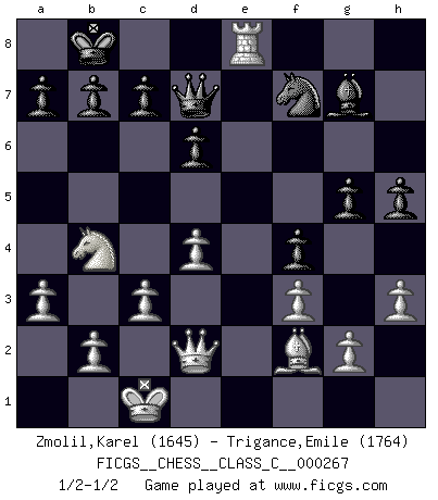 Last move : 1/2-1/2 2019 March 6 8:23:46 [Event "FICGS__CHESS__CLASS_C__000267"] [Site "FICGS"] [Date "2019.02.14"] [Round "1"] [White "Zmolil,Karel"] [Black "Trigance,Emile"] [Result "1/2-1/2"] [WhiteElo "1645"] [BlackElo "1764"] 1.e4 e5 2.Nf3 Nf6 3.d3 d6 4.h3 g6 5.Bg5 Bg7 6.Nc3 h6 7.Bh4 g5 8.Bg3 Nc6 9.Be2 Nh5 10.Bh2 Nf4 11.Bf1 Be6 12.Qd2 Qd7 13.Ne2 O-O-O 14.c3 f5 15.Nxf4 exf4 16.exf5 Bxf5 17.O-O-O Rhe8 18.Ne1 Re7 19.Nc2 Rde8 20.f3 Kb8 21.Bg1 Ne5 22.d4 Nf7 23.Bf2 h5 24.a3 Qa4 25.Bd3 Bxd3 26.Qxd3 Re2 27.Rd2 Rxd2 28.Qxd2 Qc4 29.Re1 Qc6 30.Nb4 Qd7 31.Rxe8+ 1/2-1/2 Petrov's defense Queenside Castling by player Black (move 13) Queenside Castling by player White (move 17) This chess game ended in a draw. Follow this game move after move (download)Let the perfectionist play postal. (Yasser Seirawan) Du musst Deinen Gegner in einen tiefen dunklen Wald führen wo 2+2=5 ist und wo der Weg, der wieder hinausführt, nur breit genug für einen ist. (Mikhail Nekhemyevich Tal) Yo jugué Ajedrez con el y a veces le pude haber ganado solo que siempre devuelve su última jugada y juega la partida de manera diferente. (Mark Twain) Une platitude souvent récitée à propos des Echecs est qu'une des choses les plus difficiles à réaliser est de gagner une position gagnante. Cela ne manque pas de sens mais, pour ma part, j'ai toujours trouvé plus difficile de gagner une position perdante. (Tim Krabbe) Heh, heh, heh. Time to abandon ship. (General Grievous in Star Wars ep.3)