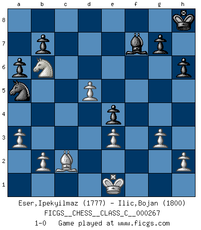 Last move : 1-0 2019 April 27 7:59:27 [Event "FICGS__CHESS__CLASS_C__000267"] [Site "FICGS"] [Date "2019.02.14"] [Round "1"] [White "Eser,Ipekyilmaz"] [Black "Ilic,Bojan"] [Result "1-0"] [WhiteElo "1777"] [BlackElo "1800"] 1.a3 e5 2.d3 d5 3.d4 e4 4.f3 f5 5.fxe4 fxe4 6.g3 Nc6 7.c3 Bf5 8.c4 Nf6 9.Bg5 Be7 10.Bxf6 Bxf6 11.e3 O-O 12.cxd5 Qxd5 13.Ne2 Rad8 14.Nf4 Qd6 15.Nc3 a6 16.Bg2 Rde8 17.Qb3+ Kh8 18.Qd5 Qxd5 19.Nfxd5 Rf7 20.Nxf6 Rxf6 21.Rc1 Na5 22.Nd5 Rf7 23.Rc5 Nb3 24.Rc3 Na5 25.Rf1 c6 26.Nb6 Be6 27.Rxf7 Bxf7 28.Bf1 h6 29.Be2 Be6 30.Bd1 Rd8 31.Bc2 c5 32.Rxc5 Rd6 33.Nc8 Rd5 34.Rxd5 Bxd5 35.Nb6 Bf7 36.d5 1-0 Anderssen's Opening Kingside Castling by player Black (move 11) Player White won this chess game. Follow this game move after move (download)I'm not a materialistic person, in that, I don't suffer the lack or loss of money. The absence of worldly goods I don't look back on. For Chess is a way I can be as materialistic as I want without having to sell my soul. (Jamie Walter Adams) Die Jungen erwarten, dass Opa einfach umfällt. Dann aber kann Opa fünf Stunden lang Schach spielen und die jungen Gegner an die Wand drücken. (Viktor Kortschnoi) Existen dos clases de sacrificios: los correctos y los míos. (Mikhail Tal) Ce qui est bien, c'est d'avoir tout un tas de pièces en prise : l'adversaire ne peut en prendre qu'une à la fois. Cité par Thierry Audin. If only faces could talk... (Pat Summerall, Sportscaster during the Super Bowl)