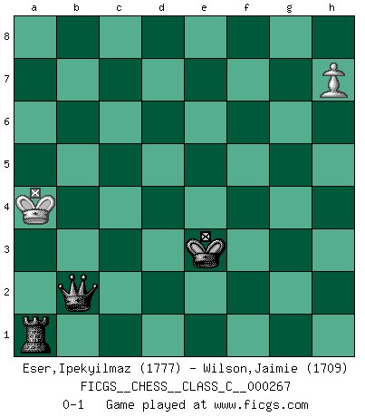 Last move : 0-1 2019 December 29 0:17:37 [Event "FICGS__CHESS__CLASS_C__000267"] [Site "FICGS"] [Date "2019.02.14"] [Round "1"] [White "Eser,Ipekyilmaz"] [Black "Wilson,Jaimie"] [Result "0-1"] [WhiteElo "1777"] [BlackElo "1709"] 1.a3 c5 2.d3 d5 3.d4 cxd4 4.Qxd4 Nc6 5.Qd1 Nf6 6.Bg5 Ne4 7.Bc1 e5 8.Nd2 Bf5 9.Nxe4 Bxe4 10.f3 Bg6 11.e3 Bc5 12.Nh3 O-O 13.Nf2 a5 14.Be2 Qb6 15.Qd2 Rad8 16.Nd3 e4 17.Nxc5 Qxc5 18.f4 d4 19.Rb1 dxe3 20.Qc3 Qxc3+ 21.bxc3 Rd7 22.Bxe3 Ne7 23.Bc5 Rc8 24.Bxe7 Rxe7 25.Rb5 Rxc3 26.f5 Rxa3 27.Rd5 Kf8 28.fxg6 hxg6 29.Rf1 Rc7 30.Rf4 f5 31.Bd1 Ke7 32.Rb5 Ra1 33.Rf2 a4 34.Rd2 a3 35.c3 Rxc3 36.Rxb7+ Kf6 37.Rb6+ Kg5 38.R2d6 Kf4 39.g3+ Ke3 40.Rd2 g5 41.Rbd6 f4 42.Re2+ Kf3 43.Rc2 Rxd1+ 44.Kxd1 Rxc2 45.Kxc2 e3 46.gxf4 gxf4 47.Rd1 e2 48.Ra1 Ke3 49.h3 f3 50.Rxa3+ Kf2 51.Ra4 e1Q 52.Rg4 Ke3 53.Rxg7 Qd2+ 54.Kb1 Qd3+ 55.Ka2 Qc2+ 56.Ka3 Qc3+ 57.Ka4 Qxg7 58.h4 Qb2 59.h5 f2 60.h6 f1R 61.h7 Ra1+ 0-1 Anderssen's Opening Kingside Castling by player Black (move 12) 10 pieces endgame at move 45 : White KRPP , Black KPPPPP WHITE : King + 1 Rook 2 Pawns BLACK : King + 5 Pawns 9 pieces endgame at move 46 : White KRPP , Black KPPPP WHITE : King + 1 Rook 2 Pawns BLACK : King + 4 Pawns 8 pieces endgame at move 46 : White KRP , Black KPPPP WHITE : King + 1 Rook 1 Pawn BLACK : King + 4 Pawns 7 pieces endgame at move 50 : White KRP , Black KPPP WHITE : King + 1 Rook 1 Pawn BLACK : King + 3 Pawns Promotion Queen by player Black (move 51) 6 pieces endgame at move 53 : White KRP , Black KQP WHITE : King + 1 Rook 1 Pawn BLACK : King + 1 Queen 1 Pawn 5 pieces endgame at move 57 : White KP , Black KQP WHITE : King + 1 Pawn BLACK : King + 1 Queen 1 Pawn Promotion Rook by player Black (move 60) Player Black won this chess game. Follow this game move after move (download)Place the contents of the Chess box in a hat, shake them up vigorously, pour them on the board from a height of two feet, and you get the style of Steinitz. (H. E. Bird) Wenn du nicht weißt was du tun sollst, warte bis dein Gegner eine Idee hat. Sie wird sicher schlecht sein. (Siegbert Tarrasch) El Ajedrez es parte de una cultura y si una cultura esta en decadencia, entonces también el Ajedrez declinará. (Mikhail Botvinnik) Les échecs, c'est l'art d'analyser. (Mikhail Botvinnik) As the days dwindle down... to a precious few. (Maxwell Anderson)