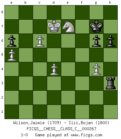 Last move : 1-0 2019 March 22 17:9:20 [Event "FICGS__CHESS__CLASS_C__000267"] [Site "FICGS"] [Date "2019.02.14"] [Round "1"] [White "Wilson,Jaimie"] [Black "Ilic,Bojan"] [Result "1-0"] [WhiteElo "1709"] [BlackElo "1800"] 1.c4 e5 2.e3 d6 3.Nc3 Nf6 4.d4 exd4 5.exd4 Be7 6.Nf3 O-O 7.Be2 h6 8.O-O Re8 9.h3 Bf5 10.Bf4 Nbd7 11.Bd3 Bxd3 12.Qxd3 a6 13.a4 Nh7 14.Ne4 Ndf6 15.Ng3 d5 16.c5 c6 17.a5 Nd7 18.Nf5 Bg5 19.Bxg5 Nxg5 20.Nd6 Nxf3+ 21.Qxf3 Qe7 22.Rae1 Qxe1 23.Qxf7+ Kh8 24.Rxe1 Rxe1+ 25.Kh2 Nf6 26.Qxb7 Rf8 27.Nf5 Ne8 28.g4 Re2 29.Qxc6 Rxf2+ 30.Kg3 Rxb2 31.Qxd5 Rb5 32.Qa2 Nf6 33.Nd6 Rb4 34.Nf5 Rfb8 35.Kf4 Rb3 36.Ke5 Rxh3 37.Qf7 Re8+ 38.Kd6 Rd8+ 39.Kc7 Rd7+ 40.Qxd7 Nxd7 41.Kxd7 g6 42.Ne7 Kg7 43.c6 1-0 English Opening Kingside Castling by player Black (move 6) Kingside Castling by player White (move 8) Player White won this chess game. Follow this game move after move (download)First-class players lose to second-class players because second-class players sometimes play a first-class game. (Siegbert Tarrasch) Schach sollte überall auf der Welt Schulfach werden. Es fördert die geistige Auseinandersetzung. Es lehrt die Demut in der Niederlage. (Garry Kasparov) Yo jugué Ajedrez con el y a veces le pude haber ganado solo que siempre devuelve su última jugada y juega la partida de manera diferente. (Mark Twain) Plusieurs personnes se sont demandées comment Tal faisait pour gagner... En fait, c'est très simple ! Il met ses pièces au centre de l'échiquier et les sacrifie quelque part ! (David Bronstein) To err is human, but to really foul things up requires a computer. (Farmer's Almanac, 1978)