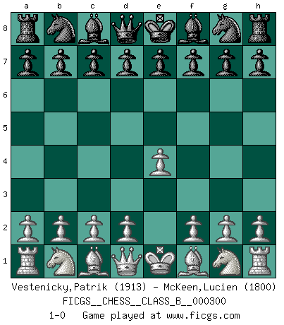 Last move : 1-0 2019 March 29 12:56:56 [Event "FICGS__CHESS__CLASS_B__000300"] [Site "FICGS"] [Date "2019.02.17"] [Round "1"] [White "Vestenicky,Patrik"] [Black "McKeen,Lucien"] [Result "1-0"] [WhiteElo "1913"] [BlackElo "1800"] 1.e4 1-0 This chess game has been lost on time (started : 2019.02.17 4:20:14) King's pawn Opening Player White won this chess game. Follow this game move after move (download)Strategy requires thought, tactics require observation. (Max Euwe) Es liegt in der Natur, vernüftig zu denken und unlogisch zu handeln. (Anatole France) La mitad de las variaciones que son calculadas en una partida de torneo, resultan ser completamente superfluas. Desafortunadamente, nadie sabe por adelantado cual mitad. (Jan Tinman) Le profane ne songe pas à la somme de jouissance dont il se prive, qui méconnaît ce jeu aux ressources aussi variées que passionnantes. (Jean-Marie Jeanton-Lamarche) If you don't practice you don't deserve to win. (Andre Agassi)