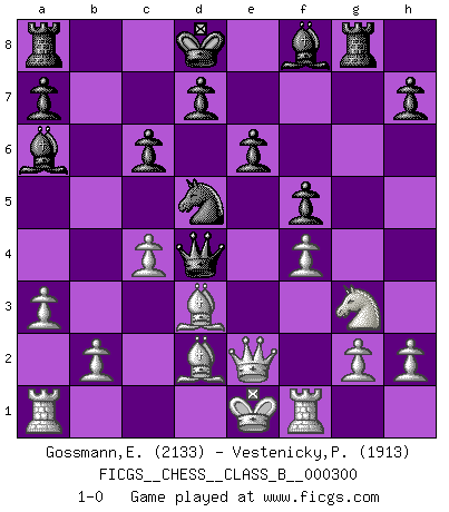 Last move : 1-0 2019 May 20 15:12:47 [Event "FICGS__CHESS__CLASS_B__000300"] [Site "FICGS"] [Date "2019.02.17"] [Round "1"] [White "Gossmann,Ewald"] [Black "Vestenicky,Patrik"] [Result "1-0"] [WhiteElo "2133"] [BlackElo "1913"] 1.e4 c5 2.Nf3 e6 3.d4 cxd4 4.Nxd4 Nc6 5.Nc3 Nf6 6.Nxc6 bxc6 7.e5 Nd5 8.Ne4 Qc7 9.f4 Qb6 10.Bd3 f5 11.exf6 gxf6 12.a3 Ba6 13.Qh5+ Ke7 14.c4 Qd4 15.Qe2 f5 16.Ng3 Kd8 17.Rf1 Rg8 18.Bd2 1-0 This chess game has been lost on time (started : 2019.02.17 4:20:14) Sicilian : Taimanov variation Player White won this chess game. Follow this game move after move (download)Many have become Chess Masters, no one has become the Master of Chess. (Siegbert Tarrasch) Der vorletzte Fehler gewinnt. (Savielly Grigorievitsch Tartakower) El Ajedrez es el juego mas altamente simbólico, pero las agresiones estan por lo tanto aún mas francamente representadas en la partida. Tal vez comenzo como un juego de guerra; Algo como la representación de una batalla en miniatura entre las fuerzas de dos reinos. (Karl Meninger) Il vaut toujours mieux jouer un plan faux de façon logique que de n'avoir pas de plan du tout. (Victor Kortchnoï) Creativity involves breaking out of established patterns in order to look at things in a different way. (Edward De Bono)
