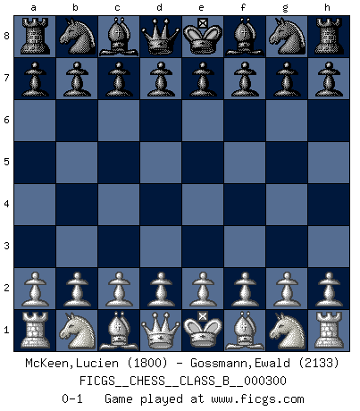 Last move : 0-1 2019 March 29 12:56:56 [Event "FICGS__CHESS__CLASS_B__000300"] [Site "FICGS"] [Date "2019.02.17"] [Round "1"] [White "McKeen,Lucien"] [Black "Gossmann,Ewald"] [Result "0-1"] [WhiteElo "1800"] [BlackElo "2133"] 0-1 This chess game has been lost on time (started : 2019.02.17 4:20:14) Player Black won this chess game. Follow this game move after move (download)Chess is ruthless: you've got to be prepared to kill people. (Nigel Short) Wer der Ansicht ist, daß alle Schachspieler verrückt sind, wird durch Studium des Lebens von Emil Josef Diemer nicht auf andere Gedanken kommen. (Hans Ree) Un buen sacrificio es aquel que aunque no sea necesariamente sólido, deja a tu oponente aturdido y confuso. (Rudolph Spielmann) Vous m'avez demandé de vous exposer quel est le fondement de la prière. Je ne fais que préparer les pièces du jeu sur la table... Nous sera-t-il permis d'en adopter les règles et si nous les appliquons scrupuleusement nous ne tarderons pas à faire mat le Roi divin ! Il ne pourra échapper à nos mains. (Sainte Thérèse d'Avila, Chemin de perfection) The best teachers teach from the heart, not from the book. (Author unknown)