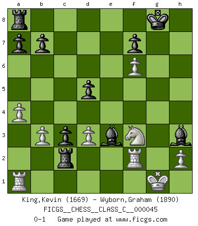 Last move : 0-1 2007 November 2 2:19:34 [Event "FICGS__CHESS__CLASS_C__000045"] [Site "FICGS"] [Date "2007.06.03"] [Round "1"] [White "King,Kevin"] [Black "Wyborn,Graham"] [Result "0-1"] [WhiteElo "1669"] [BlackElo "1890"] 1.e4 c5 2.Nc3 Nc6 3.f4 g6 4.Nf3 Bg7 5.Bb5 Nd4 6.Bd3 d6 7.Nxd4 cxd4 8.Ne2 Bd7 9.O-O Nf6 10.b3 e5 11.Bb2 O-O 12.a4 Re8 13.Ng3 h5 14.f5 h4 15.Nh1 gxf5 16.exf5 Qb6 17.Nf2 e4 18.Bxe4 Nxe4 19.d3 Nc3 20.Qg4 d5 21.Bxc3 dxc3 22.Kh1 Qf6 23.Nh3 Re5 24.Qg5 Qxg5 25.Nxg5 Re2 26.Kg1 Rxc2 27.f6 Bh6 28.Nf3 h3 29.gxh3 Bxh3 30.Rf2 Be3 0-1 Sicilian : Grand Prix attack Kingside Castling by player White (move 9) Kingside Castling by player Black (move 11) Player Black won this chess game. Follow this game move after move (download)A bad plan is better than none at all. (Frank Marshall) Fischer machte Schach einfach zu einer aufregenden Sache, wann immer er sich ans Brett setzte. (Raymond Keene) La señal de un Gran Maestro es su habilidad de ganar una partida rápidamente y sin dolor. (Irving Chernev) RxDa4 pat (...) Wisdom doesn't necessarily come with age. Sometimes age just shows up all by itself. (Tom Wilson)
