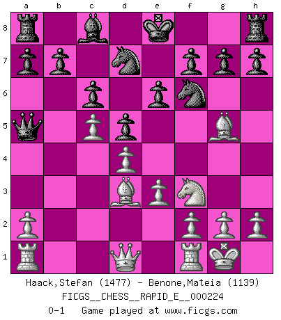 Last move : 0-1 2019 May 7 19:31:25 [Event "FICGS__CHESS__RAPID_E__000224"] [Site "FICGS"] [Date "2019.02.18"] [Round "1"] [White "Haack,Stefan"] [Black "Benone,Mateia"] [Result "0-1"] [WhiteElo "1477"] [BlackElo "1139"] 1.d4 Nf6 2.Nf3 d5 3.c4 e6 4.Nc3 c6 5.Bg5 Nbd7 6.e3 Qa5 7.Bd3 Bb4 8.O-O Bxc3 9.bxc3 Qxc3 10.c5 Qa5 0-1 This chess game has been lost on time (started : 2019.02.18 20:21:39) Queen's pawn game Kingside Castling by player White (move 8) Player Black won this chess game. Follow this game move after move (download)We don't really know how the game was invented, though there are suspicions. As soon as we discover the culprits, we'll let you know. (Bruce Pandolfini) Die jungen Leute sollen verstehen, dass sie noch etwas von mir lernen können und müssen. (Viktor Kortschnoi) El jugador de combinación piensa hacia adelante; comienza de la posición dada y trabaja las movidas contundentes en su mente. (Emanuel Lasker) Dans le domaine de la peinture, de la gravure et de la sculpture, dès la première décennie de notre siècle, les artistes abandonnent la représentation de la partie d'échecs pour se concentrer sur les pièces, sur les échiquiers et sur toutes les variations auxquelles les unes et les autres peuvent donner lieu. On passe en quelque sorte d'un thème social à un thème musical (au sens de la musica médiévale, c'est-à-dire d'une notion qui inclue le rythme, l'harmonie, la construction et la déconstruction, etc.). Graphiquement et picturalement, l'échiquier apparaît comme une structure ouverte, dynamique, d'une richesse infinie, autorisant toutes les combinatoires et débouchant sur des mouvements et des rythmes de nature exponentielle. (Michel Pastoureau) Mac users swear by their computers. PC users swear at their computers. (Author unknown)