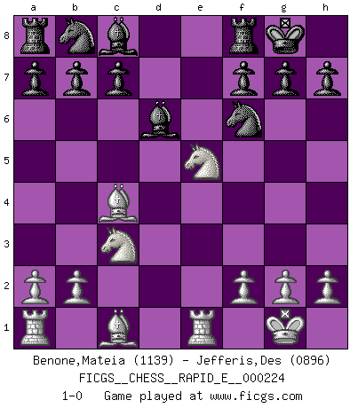 Last move : 1-0 2019 May 8 19:40:45 [Event "FICGS__CHESS__RAPID_E__000224"] [Site "FICGS"] [Date "2019.02.18"] [Round "1"] [White "Benone,Mateia"] [Black "Jefferis,Des"] [Result "1-0"] [WhiteElo "1139"] [BlackElo "0896"] 1.e4 e5 2.d4 exd4 3.c3 d6 4.Bc4 Nf6 5.Nf3 Be7 6.e5 dxe5 7.Nxe5 O-O 8.O-O dxc3 9.Nxc3 Qxd1 10.Rxd1 Bd6 11.Re1 1-0 This chess game has been lost on time (started : 2019.02.18 20:21:39) Danish gambit Kingside Castling by player Black (move 7) Kingside Castling by player White (move 8) Player White won this chess game. Follow this game move after move (download)Fischer is the strongest player in the world. In fact, the strongest player who ever lived. (Larry Evans) Wenn sie aufgeben, dann danke ich Ihnen für das Spiel (Eventualzug beim Fernschach). (Anonymous) El Ajedrez no es como la vida... ¡tiene reglas!. (Mark Pasternak) Vouloir jouer aux échecs contre soi-même est aussi paradoxal que vouloir marcher sur son ombre. (Stefan Zweig) The meaning of life is that it is to be lived, and it is not to be traded and conceptualized and squeezed into a pattern of systems. (Bruce Lee)