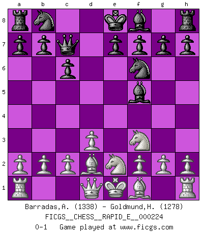 Last move : 0-1 2019 April 3 14:57:52 [Event "FICGS__CHESS__RAPID_E__000224"] [Site "FICGS"] [Date "2019.02.18"] [Round "1"] [White "Barradas,Anderson"] [Black "Goldmund,Heike"] [Result "0-1"] [WhiteElo "1338"] [BlackElo "1278"] 1.e4 d5 2.exd5 Qxd5 3.Nc3 Qa5 4.Nf3 Nf6 5.d3 Bf5 6.Bd2 c6 7.Ne2 Qc7 0-1 This chess game has been lost on time (started : 2019.02.18 20:21:39) Scandinavian (centre counter) defense Player Black won this chess game. Follow this game move after move (download)The laws of Chess do not permit a free choice: you have to move whether you like it or not. (Emanuel Lasker) Taktik ist was man tun muß, wenn etwas zu tun ist. Strategie ist was man tun muß, wenn nichts zu tun ist. (Savielly Grigorievitsch Tartakower) Del Ajedrez se ha dicho que la vida no es lo suficientemente larga para él, pero eso es culpa de la vida, no del Ajedrez. (William Ewart Napier) Les sacrifices démontrent seulement que quelqu'un a gaffé. (Savielly Tartacover) Wisdom doesn't necessarily come with age. Sometimes age just shows up all by itself. (Tom Watson)
