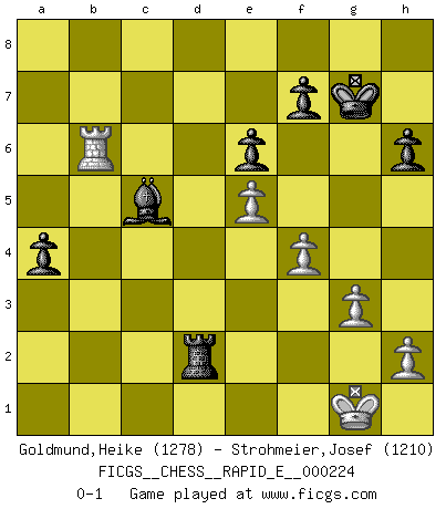 Last move : 0-1 2019 May 29 18:27:12 [Event "FICGS__CHESS__RAPID_E__000224"] [Site "FICGS"] [Date "2019.02.18"] [Round "1"] [White "Goldmund,Heike"] [Black "Strohmeier,Josef"] [Result "0-1"] [WhiteElo "1278"] [BlackElo "1210"] 1.b4 d5 2.Bb2 Nf6 3.e3 e6 4.a3 Be7 5.c4 c6 6.Nf3 O-O 7.Be2 Nbd7 8.O-O dxc4 9.Bxc4 Nb6 10.Be2 Bd7 11.Qc2 h6 12.Ne5 Rc8 13.Nxd7 Qxd7 14.d3 c5 15.Qb3 cxb4 16.axb4 a6 17.Nd2 Nbd5 18.Nc4 Qd8 19.e4 Nb6 20.Nxb6 Qxb6 21.Rfd1 Qxb4 22.Qxb4 Bxb4 23.Bf3 Rc2 24.Bxf6 gxf6 25.d4 Rd8 26.Rab1 a5 27.g3 Kg7 28.e5 fxe5 29.dxe5 Rxd1+ 30.Bxd1 Rc5 31.f4 Rb5 32.Ba4 Rd5 33.Bb3 Rd2 34.Rc1 b5 35.Rc6 a4 36.Bxa4 bxa4 37.Rb6 Bc5+ 0-1 Polish (Sokolsky) opening Kingside Castling by player Black (move 6) Kingside Castling by player White (move 8) Player Black won this chess game. Follow this game move after move (download)When you don't know what to do, wait for your opponent to get an idea - it's sure to be wrong. (Tarrasch) Auf jeden Fall musst du zuerst Rechtsanwalt werden, damit du deine eigenen Interessen und die deiner Familie vertreten kannst. [Brief an seinen Sohn] (José Raúl Capablanca) El Ajedrez es de 30 a 40 por ciento psicología. Uno no cuenta con esto cuando se juega contra una computadora. No lo puedo confundir. (Judith Polgar) Karpov est une pièce de musée. (Garry Kasparov) You lose, general Kenobi. (General Grievous in Star Wars ep.3)