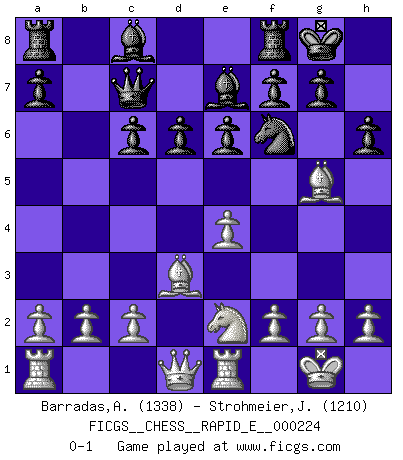 Last move : 0-1 2019 April 7 3:34:23 [Event "FICGS__CHESS__RAPID_E__000224"] [Site "FICGS"] [Date "2019.02.18"] [Round "1"] [White "Barradas,Anderson"] [Black "Strohmeier,Josef"] [Result "0-1"] [WhiteElo "1338"] [BlackElo "1210"] 1.e4 c5 2.Nf3 Nc6 3.d4 cxd4 4.Nxd4 Nf6 5.Nc3 e6 6.Bg5 Be7 7.Nxc6 bxc6 8.Bd3 O-O 9.O-O Qc7 10.Re1 d6 11.Ne2 h6 0-1 This chess game has been lost on time (started : 2019.02.18 20:21:39) Sicilian defense Kingside Castling by player Black (move 8) Kingside Castling by player White (move 9) Player Black won this chess game. Follow this game move after move (download)In the perfect Chess combination as in a first-rate short story, the whole plot and counter-plot should lead up to a striking finale, the interest not being allayed until the very last moment. (Yates and Winter) Ich bin Weltmeister und muß mit niemandem irgend etwas diskutieren. (Viswanathan Anand) El Ajedrez es un terrible juego. Si no controlas el centro, tu oponente tiene una posición mas holgada. Si tienes control del centro, ¡entonces realmente tu tienes algo de que preocuparte!. (Siegbert Tarrasch) Il a essayé de se convaincre qu'il pourrait empêcher toutes les erreurs et ne jamais perdre. L'horreur ! Gary Kasparov au sujet de Robert Fischer. Without enthusiasm, virtue functions not at all, and vice only poorly. (Mignon McLaughlin, The Neurotic's Notebook, 1960)
