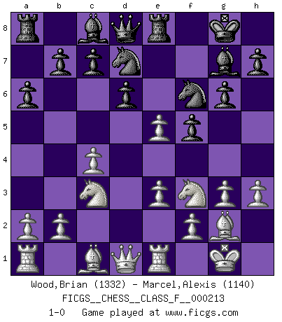 Last move : 1-0 2019 May 20 9:18:11 [Event "FICGS__CHESS__CLASS_F__000213"] [Site "FICGS"] [Date "2019.02.18"] [Round "1"] [White "Wood,Brian"] [Black "Marcel,Alexis"] [Result "1-0"] [WhiteElo "1332"] [BlackElo "1140"] 1.d4 f5 2.c4 Nf6 3.Nc3 g6 4.g3 Bg7 5.Bg2 O-O 6.Nf3 d6 7.O-O Re8 8.e3 Nbd7 9.Re1 a6 10.h3 e5 11.dxe5 1-0 Dutch with c4 & Nc3 Kingside Castling by player Black (move 5) Kingside Castling by player White (move 7) Player White won this chess game. Follow this game move after move (download)I believe that Chess possesses a magic that is also a help in advanced age. A rheumatic knee is forgotten during a game of Chess and other events can seem quite unimportant in comparison with a catastrophe on the chessboard. (Vlastimil Hort) Den Ruhm habe ich schon, jetzt brauche ich noch das Geld. (Wilhelm Steinitz) Solo existe una cosa que Fischer hace en el Ajedrez sin placer: ¡perder!. (Boris Spassky) Je fais ceci parce que dans cinquante coups j'obtiendrai cela; je m'appelle Mikhail Moisevitch Botvinnik. (Botvinnik) A mistake is only a mistake if you let it happen twice. Otherwise it is a learning experience. (Daniel Parmet)