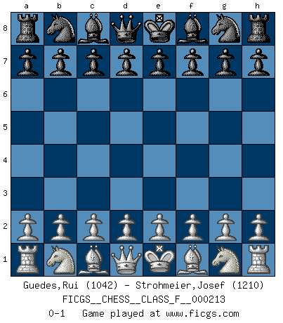 Last move : 0-1 2019 March 31 1:8:55 [Event "FICGS__CHESS__CLASS_F__000213"] [Site "FICGS"] [Date "2019.02.18"] [Round "1"] [White "Guedes,Rui"] [Black "Strohmeier,Josef"] [Result "0-1"] [WhiteElo "1042"] [BlackElo "1210"] 0-1 This chess game has been lost on time (started : 2019.02.18 20:21:50) Player Black won this chess game. Follow this game move after move (download)Chess is 99 percent tactics. (Teichmann) Das Schach ist nichts für kleine Geister, es beansprucht einen vollen Mann, der sich nicht sklavisch an das Überlieferte hält, sondern selbständig die Tiefen des Spiels zu ergründen sucht. (Wilhelm Steinitz) Yo siempre he tenido un ligero sentimiento de lástima por una persona que no tiene conocimiento del Ajedrez. (Siegbert Tarrasch) Avec des compensations pour le matériel en plus... (Anonyme) Two beer, or not two beer. (Unknown)