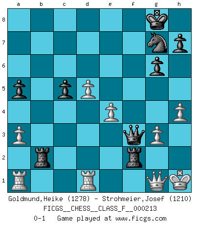Last move : 0-1 2019 June 30 18:5:54 [Event "FICGS__CHESS__CLASS_F__000213"] [Site "FICGS"] [Date "2019.02.18"] [Round "1"] [White "Goldmund,Heike"] [Black "Strohmeier,Josef"] [Result "0-1"] [WhiteElo "1278"] [BlackElo "1210"] 1.d4 d5 2.Bf4 Nf6 3.Nf3 e6 4.e3 Bd6 5.Bxd6 Qxd6 6.c4 c6 7.c5 Qe7 8.Ne5 Nbd7 9.Nf3 O-O 10.Nbd2 a5 11.Be2 b6 12.O-O bxc5 13.Qc2 c4 14.b3 cxb3 15.Nxb3 Ne4 16.Nbd2 Ba6 17.Bxa6 Rxa6 18.Nxe4 dxe4 19.Qxe4 Nf6 20.Qd3 Rfa8 21.Rfc1 Nd5 22.a3 g6 23.Ne5 Qd6 24.Qc4 Ne7 25.Qc3 Rc8 26.Nc4 Qc7 27.Ne5 f6 28.Qc4 Rb6 29.Qxe6+ Kh8 30.Qxf6+ Kg8 31.Qf7+ Kh8 32.Ng4 Nf5 33.Qf6+ Ng7 34.Ne5 Kg8 35.d5 c5 36.Qf4 Rf8 37.Qa4 Qxe5 38.e4 Qf4 39.Qc2 Rb5 40.Qc4 Qxf2+ 41.Kh1 Rb2 42.Qf1 Qd2 43.Qg1 Rf2 44.Rd1 Qg5 45.g3 Qh5 46.h4 Qf3+ 0-1 Queen's pawn, Mason variation Kingside Castling by player Black (move 9) Kingside Castling by player White (move 12) Player Black won this chess game. Follow this game move after move (download)The Chess pieces are the block alphabet which shapes thoughts; and these thoughts, although making a visual design on the chessboard, express their beauty abstractly, like a poem. (Marcel Duchamp) Aljechin war kein Nazi. Er war ein Opportunist. Ein schrecklicher Mann. Er liebte Geld über alles und würde für Geld ein Jude, ein Katolik oder ein Protestant werden. (Miguel Najdorf) Nada excita más a Grandes Maestros aburridos que una novedad teórica. (Dominic Lawson) Toutes les manuvres exécutées sur une colonne ouverte ont pour but ultime l'intrusion définitive sur la septième ou la huitième rangée, en plein cur de la position ennemie. (Aaron Nimzovitch) The greatest con, that he ever pulled... was making you believe... that he is you. (Revolver, movie)