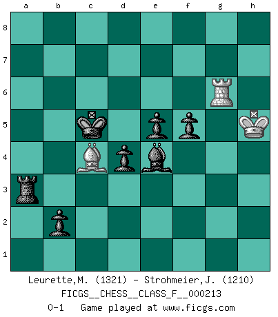 Last move : 0-1 2019 May 18 12:15:52 [Event "FICGS__CHESS__CLASS_F__000213"] [Site "FICGS"] [Date "2019.02.18"] [Round "1"] [White "Leurette,Marc-Antoine"] [Black "Strohmeier,Josef"] [Result "0-1"] [WhiteElo "1321"] [BlackElo "1210"] 1.e4 c5 2.d4 cxd4 3.c3 dxc3 4.Nxc3 Nc6 5.Nf3 d6 6.Be2 g6 7.O-O Bg7 8.Be3 a6 9.Bd4 Nf6 10.Nd5 Nxd4 11.Qxd4 O-O 12.Qd2 Nxe4 13.Qc2 Nc5 14.Rac1 Bd7 15.b4 Ne6 16.g3 Rc8 17.Qd2 Bc6 18.Kg2 Nc7 19.Nxc7 Rxc7 20.a3 Qd7 21.h4 Rfc8 22.Kh2 Qe6 23.Rfe1 Qb3 24.Qe3 Qxe3 25.fxe3 Bh6 26.Bd1 Bd7 27.Rxc7 Rxc7 28.e4 Rc3 29.a4 b5 30.axb5 axb5 31.Nd4 Rc4 32.Nc2 Bd2 33.Re2 Bxb4 34.Nxb4 Rxb4 35.Re3 Bc6 36.Bf3 Kg7 37.Kh3 h5 38.g4 hxg4+ 39.Kxg4 f5+ 40.Kf4 Bxe4 41.Be2 e5+ 42.Kg5 d5 43.Bf1 d4 44.Ra3 Ra4 45.Rb3 b4 46.Bb5 Ra2 47.Rg3 Ra3 48.Rg1 b3 49.h5 gxh5 50.Kxh5 Kf8 51.Bc4 b2 52.Rg8+ Ke7 53.Rg7+ Kd6 54.Rg6+ Kc5 0-1 Sicilian : Smith-Morra gambit Kingside Castling by player White (move 7) Kingside Castling by player Black (move 11) 10 pieces endgame at move 50 : White KRB , Black KRBPPPP WHITE : King + 1 Rook 1 Bishop BLACK : King + 1 Rook 1 Bishop 4 Pawns Player Black won this chess game. Follow this game move after move (download)In Chess, just as in life, today's bliss may be tomorrow's poison. (Assaic) Es ist im Leben wie im Schachspiel. Wir entwerfen einen Plan, dieser bleibt jedoch bedingt durch das, was im Schachspiel dem Gegner, im Leben dem Schicksal zu tun belieben wird. (Arthur Schopenhauer) El Ajedrez es la vida. (Bobby Fischer) Les Echecs ont trois composantes : le temps, l'espace et le matériel en dernier. (Mikhail Tal) I feel so... helpless. (C-3PO in Star Wars ep.3)
