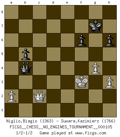 Last move : 1/2-1/2 2019 November 15 20:51:43 [Event "FICGS__CHESS__NO_ENGINES_TOURNAMENT__000105"] [Site "FICGS"] [Date "2019.02.20"] [Round "1"] [White "Niglio,Biagio"] [Black "Suwara,Kazimierz"] [Result "1/2-1/2"] [WhiteElo "1363"] [BlackElo "1766"] 1.d4 Nf6 2.Nf3 g6 3.Bf4 Bg7 4.e3 Nc6 5.Nbd2 d5 6.c3 Bf5 7.Bb5 a6 8.Ba4 b5 9.Bc2 Bxc2 10.Qxc2 O-O 11.h3 e6 12.O-O h6 13.e4 dxe4 14.Nxe4 Nxe4 15.Qxe4 Qd7 16.Rad1 g5 17.Ne5 Nxe5 18.dxe5 Qe7 19.Be3 Rfd8 20.f4 gxf4 21.Qxf4 Rd5 22.Rxd5 exd5 23.Qg4 Qe6 24.Rf5 Kh7 25.Qf3 Kg8 26.Qg4 Qg6 27.Qf3 a5 28.Bd4 Rc8 29.b4 axb4 30.cxb4 c6 31.Qf1 Ra8 32.Qf2 Qe6 33.g4 Ra4 34.Qd2 Qe7 35.Bc5 Qe8 36.Bd6 Ra3 37.Kg2 Kh7 38.Rf3 Rxf3 39.Kxf3 Bxe5 40.Bxe5 Qxe5 41.Qc2+ Kg7 42.Qxc6 Qb2 43.Qxd5 Qxb4 44.Qe5+ f6 45.Qc7+ Kg6 46.Qc2+ Kg7 1/2-1/2 King's Indian : London system Kingside Castling by player Black (move 10) Kingside Castling by player White (move 12) 10 pieces endgame at move 43 : White KQPPP , Black KQPPP WHITE : King + 1 Queen 3 Pawns BLACK : King + 1 Queen 3 Pawns This chess game ended in a draw. Follow this game move after move (download)The game of Chess is not merely an idle amusement; several very valuable qualities of the mind are to be acquired and strengthened by it, so as to become habits ready on all occasions; for life is a kind of Chess. (Benjamin Franklin) Dass jemand wie Surab Asmaiparaschwili, der selbst Elopunkte gekauft hat , Vize-Präsident der Fide werden konnte, sagt schon einges über den Zustand dieser Organisation aus. (Joel Lautier) Uno no tiene que jugar muy bien, es suficiente jugar mejor que el oponente. (Siegbert Tarrasch) Psychologiquement, tu dois avoir confiance en toi même, mais cette confiance doit être basée sur des faits. (Robert Fischer) A bird doesn't sing because it has an answer, it sings because it has a song. (Maya Angelou)