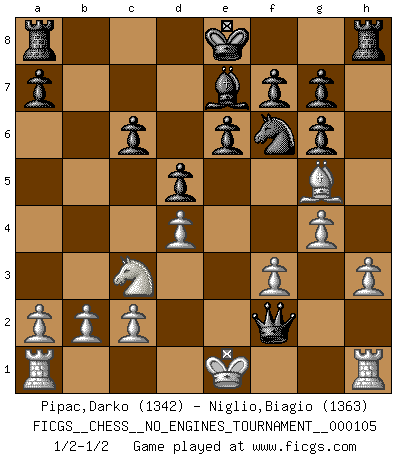 Last move : 1/2-1/2 2019 March 11 12:19:55 [Event "FICGS__CHESS__NO_ENGINES_TOURNAMENT__000105"] [Site "FICGS"] [Date "2019.02.20"] [Round "1"] [White "Pipac,Darko"] [Black "Niglio,Biagio"] [Result "1/2-1/2"] [WhiteElo "1342"] [BlackElo "1363"] 1.e4 c6 2.Nf3 d5 3.exd5 cxd5 4.d4 Nf6 5.Nc3 Bg4 6.h3 Bh5 7.Bg5 e6 8.Bb5+ Nc6 9.Bxc6+ bxc6 10.Qd2 Be7 11.Ne5 Qc7 12.g4 Bg6 13.Nxg6 hxg6 14.f3 Qg3+ 15.Qf2 Qxf2+ 1/2-1/2 Caro-Kann defense This chess game ended in a draw. Follow this game move after move (download)The defensive power of a pinned piece is only imaginary. (Aaron Nimzovich) Je mehr wir mit Computern analysieren, desto mehr glauben wir an Verteidigung. (Vladimir Kramnik) El Rey es una pieza de pelea. ¡Usenlo!. (Wilhelm Steinitz) Soyez une menace à chaque fois que vous vous asseyez pour jouer. (Ken Smith) Chess, like love, like music, has the power to make people happy. (Siegbert Tarrasch)