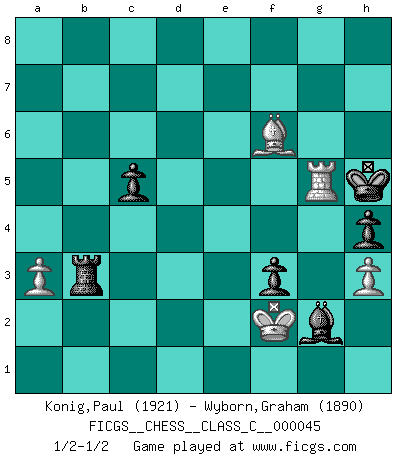 Last move : 1/2-1/2 2008 January 30 15:48:38 [Event "FICGS__CHESS__CLASS_C__000045"] [Site "FICGS"] [Date "2007.06.03"] [Round "1"] [White "Konig,Paul"] [Black "Wyborn,Graham"] [Result "1/2-1/2"] [WhiteElo "1921"] [BlackElo "1890"] 1.e4 c5 2.f4 Nc6 3.Nf3 g6 4.Bb5 Bg7 5.Bxc6 bxc6 6.d3 d6 7.O-O Nf6 8.c3 O-O 9.Na3 Qc7 10.Re1 Rb8 11.Nc2 Rd8 12.Qe2 Rb7 13.Rb1 Qa5 14.Ra1 Qa6 15.Na3 d5 16.Be3 dxe4 17.dxe4 Qxe2 18.Rxe2 Nxe4 19.Nc4 Be6 20.Na5 Rb6 21.Nb3 Rb5 22.Ng5 Bc4 23.R2e1 Nxg5 24.fxg5 Re8 25.Reb1 Reb8 26.Rc1 a5 27.Nd2 Be6 28.b3 Rd8 29.Nc4 a4 30.bxa4 R5b8 31.Na5 Bd5 32.Rab1 Rxb1 33.Rxb1 Ra8 34.Bxc5 Bxc3 35.Nc4 Bxc4 36.Rc1 Ra5 37.Be3 Rxa4 38.Rxc3 f5 39.gxf6 exf6 40.a3 Bd5 41.Bc5 Re4 42.Kf2 Kf7 43.g3 g5 44.Bb6 Ra4 45.Bc5 Rg4 46.Ke2 f5 47.h3 Re4+ 48.Kd2 h5 49.Re3 Rc4 50.Rc3 Ra4 51.Bb4 f4 52.gxf4 gxf4 53.Rc1 Ra8 54.Ra1 Bg2 55.Ke2 h4 56.Kf2 Rg8 57.Rg1 f3 58.Re1 Rb8 59.Re7+ Kf6 60.Re4 c5 61.Bc3+ Kg5 62.Rg4+ Kh5 63.Bf6 Rb3 64.Rg5+ 1/2-1/2 Sicilian : Grand Prix attack Kingside Castling by player White (move 7) Kingside Castling by player Black (move 8) This chess game ended in a draw. Follow this game move after move (download)There are tough players and nice guys, and I'm a tough player. (Bobby Fischer) Spiel ein langweiliges Spiel zu Ende und lustige Dinge können passieren. (Hans Ree) ¿Que sería del Ajedrez sin errores graciosos?. (Kurt Richter) On entre au jeu d'Echecs comme on entre en Religion. Pour le joueur d'Echecs, la partie d'Echecs c'est l'office, la messe, le défilé du 1er Mai, le dépôt de gerbe au Monument aux Morts. C'est un drame sacré. (Michel Roos) The existence of forgetting has never been proved: We only know that some things don't come to mind when we want them. (Friedrich Nietzsche)