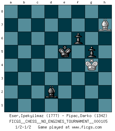 Last move : 1/2-1/2 2019 August 22 12:30:20 [Event "FICGS__CHESS__NO_ENGINES_TOURNAMENT__000105"] [Site "FICGS"] [Date "2019.02.20"] [Round "1"] [White "Eser,Ipekyilmaz"] [Black "Pipac,Darko"] [Result "1/2-1/2"] [WhiteElo "1777"] [BlackElo "1342"] 1.a3 e5 2.d3 d5 3.d4 exd4 4.Qxd4 Nc6 5.Qd3 h6 6.g3 Nf6 7.Bg2 Ne5 8.Qd1 Bc5 9.Nf3 Nxf3+ 10.exf3 O-O 11.Kf1 c6 12.Be3 Qe7 13.Bd4 Re8 14.Bxf6 Qxf6 15.c3 Bg4 16.h3 Bf5 17.f4 Rad8 18.Bf3 Qe6 19.Kg2 d4 20.Qa4 Bxb1 21.Rhxb1 dxc3 22.bxc3 Rd2 23.Rf1 Qe3 24.Qd1 Rxf2+ 25.Kh1 Rxf1+ 26.Qxf1 Qxc3 27.Rd1 Qxa3 28.Ra1 Qb2 29.Rb1 Qf2 30.Qxf2 Bxf2 31.Rxb7 Bxg3 32.Bxc6 Re6 33.Bd5 Rf6 34.Rxa7 Rxf4 35.Ra3 Bh4 36.Rf3 Rxf3 37.Bxf3 g5 38.Kg2 Kg7 39.Be4 Be1 40.Kf3 Kf6 41.Kg4 Bd2 42.h4 Be1 43.hxg5+ hxg5 44.Bh7 Bd2 45.Bb1 Ke5 46.Bh7 Kf6 47.Bb1 Ke5 48.Bh7 f6 1/2-1/2 Anderssen's Opening Kingside Castling by player Black (move 10) 10 pieces endgame at move 34 : White KRBP , Black KRBPPP WHITE : King + 1 Rook 1 Bishop 1 Pawn BLACK : King + 1 Rook 1 Bishop 3 Pawns 9 pieces endgame at move 36 : White KBP , Black KRBPPP WHITE : King + 1 Bishop 1 Pawn BLACK : King + 1 Rook 1 Bishop 3 Pawns 8 pieces endgame at move 37 : White KBP , Black KBPPP WHITE : King + 1 Bishop 1 Pawn BLACK : King + 1 Bishop 3 Pawns 7 pieces endgame at move 43 : White KBP , Black KBPP WHITE : King + 1 Bishop 1 Pawn BLACK : King + 1 Bishop 2 Pawns 6 pieces endgame at move 43 : White KB , Black KBPP WHITE : King + 1 Bishop BLACK : King + 1 Bishop 2 Pawns This chess game ended in a draw. Follow this game move after move (download)I feel as if I were a piece in a game of Chess, when my opponent says of it: That piece cannot be moved. (Soren Kierkegaard) Schach ist das schnellste Spiel der Welt, weil man in jeder Sekunde Tausende von Gedanken ordnen muß. (Albert Einstein) Muchos se han convertido en Maestros de Ajedrez, nadie se ha convertido en el Maestro del Ajedrez. (Siegbert Tarrasch) Le pion, dans sa simplicité, marche droit devant lui, mais lorsqu'il prend, il le fait obliquement? Ainsi l'homme, tant qu'il reste pauvre, marche dans la droiture et vit honnêtement, mais lorsqu'il recherche les honneurs, il flatte, se parjure et, par les voies obliques, cherche une position supérieure sur l'échiquier du monde. (Jean de Galles) Everybody lies. (Gregory House, House M.D.)
