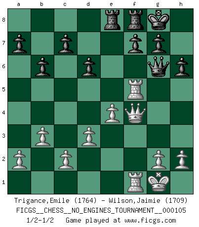 Last move : 1/2-1/2 2019 March 6 14:30:32 [Event "FICGS__CHESS__NO_ENGINES_TOURNAMENT__000105"] [Site "FICGS"] [Date "2019.02.20"] [Round "1"] [White "Trigance,Emile"] [Black "Wilson,Jaimie"] [Result "1/2-1/2"] [WhiteElo "1764"] [BlackElo "1709"] 1.f4 Nf6 2.Nf3 d6 3.e3 e5 4.fxe5 Ng4 5.Be2 Nc6 6.O-O Ngxe5 7.Nxe5 Nxe5 8.b3 Be7 9.Bb2 O-O 10.d3 Be6 11.Nd2 Qd7 12.Nf3 Ng4 13.Qd2 Bf6 14.Bxf6 Nxf6 15.e4 Ng4 16.Ng5 h6 17.Nxe6 Qxe6 18.Bxg4 Qxg4 19.Rf4 Qe6 20.Raf1 Rae8 21.Qf2 b6 22.Rf5 Qg6 23.Qf4 1/2-1/2 Bird's Opening Kingside Castling by player White (move 6) Kingside Castling by player Black (move 9) This chess game ended in a draw. Follow this game move after move (download)Via the squares on the chessboard, the Indians explain the movement of time and the age, the higher influences which control the world and the ties which link Chess with the human soul. (Al-Masudi) Charakterschwächen offenbaren sich normalerweise während einer Schachpartie. (Garry Kasparov) Las combinaciones han sido siempre el aspecto más intrigante del Ajedrez. Los Maestros las buscan, el público las aplauden, los críticos las alaban. La razón se debe a que las combinaciones hacen posible que el Ajedrez sea más que un ejercicio matemático con una carencia de vida. Ellas son la poesía del juego, son del Ajedrez lo que la melodía es de la música. Ellas representan el triunfo de la mente sobre la materia. (Reuben Fine) Les Echecs représentent une sphère d'idées créatrices basée sur la volonté des deux protagonistes. (Smyslov) Waiting for chance ? Play in casinos. (FICGS proverb)
