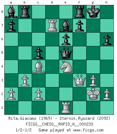 Last move : 1/2-1/2 2019 March 29 22:40:51 [Event "FICGS__CHESS__RAPID_A__000233"] [Site "FICGS"] [Date "2019.02.21"] [Round "1"] [White "Rita,Giacomo"] [Black "Sternik,Ryszard"] [Result "1/2-1/2"] [WhiteElo "1969"] [BlackElo "2092"] 1.e4 c5 2.Nf3 e6 3.d4 cxd4 4.Nxd4 Nf6 5.Bd3 Nc6 6.Nxc6 bxc6 7.O-O d5 8.Qe2 Be7 9.Bg5 h6 10.Bf4 O-O 11.Nd2 dxe4 12.Nxe4 Nd5 13.Bd2 Qc7 14.Rad1 Nf4 15.Bxf4 Qxf4 16.g3 Qc7 17.Kg2 Rb8 18.b3 Bb7 19.Ba6 Ba8 20.Rd3 c5 21.f3 g5 22.Rfd1 g4 23.Rd7 gxf3+ 24.Qxf3 Qe5 25.Re1 Rb4 26.Bc4 Rb7 27.R7d1 R7b8 28.Rd7 1/2-1/2 Sicilian : Anderssen variation Kingside Castling by player White (move 7) Kingside Castling by player Black (move 10) This chess game ended in a draw. Follow this game move after move (download)The older I grow, the more I value pawns. (Paul Keres) Ich spiele 70 Eröffnungssysteme. (Viktor Kortschnoi) ¿Esta Bobby Fischer algo cuerdo?. (Salo Flohr) Botvinnik disait en comparant les échecs à la musique: Il existe une science dont le but est l'étude de l'acoustique et des sons. Mais il y a aussi un art qui se sert de l'océan des sons : c'est la musique. De toute évidence, il en est de même pour la pensée. La logique est l'étude des lois de la réflexion et les échecs reflètent, en tant qu'art, le côté logique de la réflexion, sous la forme d'images artistiques... Extrait de Fischer - Spassky, Reykjavik 1972 par Alexander & F. Wyndham (Ed. Solar), p 37. A good programmer is someone who always looks both ways before crossing a one-way street. (Doug Linder)