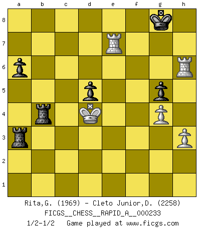 Last move : 1/2-1/2 2019 April 7 13:0:1 [Event "FICGS__CHESS__RAPID_A__000233"] [Site "FICGS"] [Date "2019.02.21"] [Round "1"] [White "Rita,Giacomo"] [Black "Cleto Junior,Dirceu"] [Result "1/2-1/2"] [WhiteElo "1969"] [BlackElo "2258"] 1.e4 e6 2.d4 d5 3.Nc3 Nf6 4.e5 Nfd7 5.f4 c5 6.Nf3 Nc6 7.Be3 Be7 8.dxc5 Bxc5 9.Qd2 Qb6 10.Bxc5 Nxc5 11.O-O-O O-O 12.Nd4 Rd8 13.Be2 Bd7 14.Qe3 Be8 15.Rd2 Rac8 16.Kb1 Nxd4 17.Rxd4 Nd7 18.Rhd1 a6 19.a3 Rc6 20.f5 Qc7 21.Re1 Nxe5 22.Bxa6 bxa6 23.Qxe5 Qd6 24.Qxd6 Rcxd6 25.g4 g5 26.Re2 h6 27.b3 Bc6 28.fxe6 fxe6 29.Kb2 Kf7 30.Nd1 Kf6 31.Ne3 R6d7 32.Rd1 Kg7 33.Nf1 Re8 34.Rde1 Bb5 35.Re5 Rf7 36.Ne3 R7f8 37.h3 Bd7 38.Re2 Rb8 39.c4 Ba4 40.cxd5 Bxb3 41.Kc3 Bxd5 42.Nxd5 exd5 43.Re7+ Kg8 44.R2e6 Rf3+ 45.Kd4 Rxa3 46.Rxh6 Rb4+ 1/2-1/2 French : Steinitz, Boleslavsky variation Queenside Castling by player White (move 11) Kingside Castling by player Black (move 11) This chess game ended in a draw. Follow this game move after move (download)First-class players lose to second-class players because second-class players sometimes play a first-class game. (Siegbert Tarrasch) Jede Eröffnung ist gut genug um gespielt zu werden, wenn nur ihr Ruf schlecht genug ist. (Savielly Grigorievitsch Tartakower) Hay dos clases de hombres: aquellos que se conforman en dejarse llevar por las circunstancias y que juegan barajas y aquellos decididos a controlar las circunstancias y que juegan al Ajedrez. (Mortimer Collins) Je ne suis pas le dernier à jouer lâchement des coups douteux pendant le zeïtnot de l'adversaire pour l'achever: en effet les coups qui font le plus peur sont ceux que l'on ne comprend pas. Je me fais souvent peur quand je joue. (Un professeur anonyme) Cactus - It is depressed cucumber. (Ilmars Cirulis)
