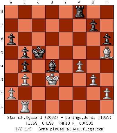Last move : 1/2-1/2 2019 April 29 16:23:41 [Event "FICGS__CHESS__RAPID_A__000233"] [Site "FICGS"] [Date "2019.02.21"] [Round "1"] [White "Sternik,Ryszard"] [Black "Domingo,Jordi"] [Result "1/2-1/2"] [WhiteElo "2092"] [BlackElo "1959"] 1.e4 e5 2.Nf3 f5 3.Nxe5 Qf6 4.d4 d6 5.Nf3 fxe4 6.Nfd2 Qxd4 7.Nc3 Nf6 8.Ndxe4 Qxd1+ 9.Kxd1 Nxe4 10.Nxe4 d5 11.Ng5 Be7 12.Bb5+ Nc6 13.Re1 h6 14.Ne6 Bxe6 15.Rxe6 Kd7 16.Re5 Kd6 17.Re2 Rhf8 18.c3 Rae8 19.f4 Bf6 20.g3 a6 21.Bd3 Rxe2 22.Bxe2 Na5 23.Bh5 c5 24.Rb1 b5 25.Kc2 d4 26.cxd4 Bxd4 27.b3 Nc6 28.Bd2 Nb4+ 29.Bxb4 cxb4 30.Kd3 Kc5 1/2-1/2 Latvian counter-gambit This chess game ended in a draw. Follow this game move after move (download)The chessboard is the world, the pieces are the phenomena of the Universe, the rules of the game are what we call the laws of Nature and the player on the other side is hidden from us. (Thomas Huxley) Schach ist gnadenlos. Du mußt bereit sein zu töten. (Nigel Short) El Ajedrez es en su esencia, un juego. En su forma, un arte. Y en su ejecución, una ciencia. (Baron Tassilo) Tout change constamment, y compris dans le monde des Echecs. (Botvinnik) Do you know these so called Volunteers don't even get paid! (Simpsons)