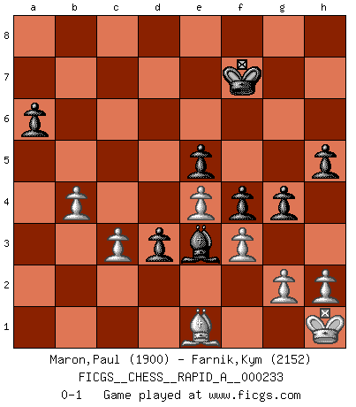 Last move : 0-1 2019 May 3 18:33:59 [Event "FICGS__CHESS__RAPID_A__000233"] [Site "FICGS"] [Date "2019.02.21"] [Round "1"] [White "Maron,Paul"] [Black "Farnik,Kym"] [Result "0-1"] [WhiteElo "1900"] [BlackElo "2152"] 1.d4 Nf6 2.Nf3 d5 3.e3 c5 4.c3 e6 5.Bd3 Nbd7 6.O-O b6 7.Nbd2 Bb7 8.Re1 Ne4 9.dxc5 Bxc5 10.Qa4 f5 11.Ne5 Nef6 12.Nc6 Qc7 13.Nd4 Kf7 14.N2f3 h6 15.b4 Be7 16.Bb2 a6 17.Rec1 Qd6 18.Qc2 Rhc8 19.a3 b5 20.a4 bxa4 21.Rxa4 Nb6 22.Ra2 Ne4 23.Nb3 Qc7 24.Na5 Bf6 25.Nd4 Nc4 26.Bxc4 dxc4 27.Nxb7 Qxb7 28.Rca1 g6 29.Qe2 e5 30.Nc2 Qc6 31.f3 Nd6 32.Ra5 Nb5 33.e4 f4 34.Qe1 Bd8 35.R5a2 Bb6+ 36.Kh1 Rd8 37.Na3 Rd3 38.Nxb5 Qxb5 39.Bc1 Rad8 40.Rd2 R8d6 41.R1a2 Qd7 42.Rxd3 Rxd3 43.Bd2 g5 44.Qe2 h5 45.Rb2 Qa4 46.Be1 Qd1 47.Rd2 Qxe2 48.Rxe2 g4 49.Rd2 Be3 50.Rxd3 cxd3 0-1 Queen's pawn game Kingside Castling by player White (move 6) Player Black won this chess game. Follow this game move after move (download)After a bad opening, there is hope for the middle game. After a bad middle game, there is hope for the endgame. But once you are in the endgame, the moment of truth has arrived. (Edmar Mednis) Zu meiner Zeit war ein 20 jähriger ein junger Spieler, heute ist er ein Veteran. (Garry Kasparov) En partidas rápidas, el Caballo es mas poderoso que el Alfil. (Vlastimil Hort) Le thème de l'attaque double intervient d'une manière ou d'une autre dans l'immense majorité des combinaisons. (Youri Averbakh) When you stop learning you start dying. (M. Scott Adams)