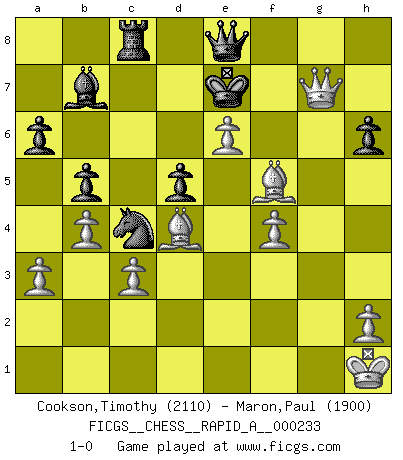 Last move : 1-0 2019 May 14 12:10:14 [Event "FICGS__CHESS__RAPID_A__000233"] [Site "FICGS"] [Date "2019.02.21"] [Round "1"] [White "Cookson,Timothy"] [Black "Maron,Paul"] [Result "1-0"] [WhiteElo "2110"] [BlackElo "1900"] 1.e4 e6 2.d4 d5 3.Nc3 Nf6 4.e5 Nfd7 5.f4 c5 6.Nf3 Nc6 7.Be3 a6 8.Qd2 b5 9.Be2 Be7 10.a3 Bb7 11.O-O O-O 12.Nd1 cxd4 13.Nxd4 Qc7 14.Nf2 Nc5 15.Rac1 Rac8 16.b4 Nd7 17.Bd3 Nxd4 18.Bxd4 f5 19.c3 Nb6 20.g4 Nc4 21.Qe2 Qd7 22.Nh3 g6 23.gxf5 gxf5 24.Kh1 Qe8 25.Rg1+ Kh8 26.Ng5 Bxg5 27.Rxg5 h6 28.Rh5 Kh7 29.Qf3 Rg8 30.Rxf5 exf5 31.Bxf5+ Kg7 32.Rg1+ Kf8 33.Rxg8+ Kxg8 34.e6 Kf8 35.Qg4 Ke7 36.Qg7+ 1-0 French : Steinitz, Boleslavsky variation Kingside Castling by player White (move 11) Kingside Castling by player Black (move 11) Player White won this chess game. Follow this game move after move (download)I won't play with you anymore. You have insulted my friend. - When an opponent cursed himself for a blunder. (Miguel Najdorf) Das Zentrum ist der Balkan des Schachbretts - Kriegshandlungen können in jedem Moment ausbrechen. (Aaron Nimzowitsch) Me siento como si fuera una pieza en una partida de Ajedrez, cuando mi oponente me indica: esa pieza no puede ser movida. (Soren Kierkegaard) Le moment que je préfère le plus dans une rencontre, c'est celui où je sens que la personnalité de l'adversaire se brise. (Robert Fischer) Whoever said the pen is mightier than the sword obviously never encountered automatic weapons. (US General Douglas MacArthur)