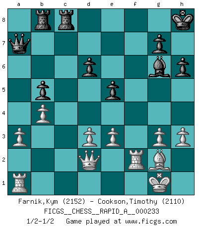 Last move : 1/2-1/2 2019 April 17 3:32:30 [Event "FICGS__CHESS__RAPID_A__000233"] [Site "FICGS"] [Date "2019.02.21"] [Round "1"] [White "Farnik,Kym"] [Black "Cookson,Timothy"] [Result "1/2-1/2"] [WhiteElo "2152"] [BlackElo "2110"] 1.Nf3 c5 2.c4 Nf6 3.Nc3 Nc6 4.g3 e5 5.Bg2 d6 6.O-O Be7 7.a3 O-O 8.Rb1 a6 9.d3 Rb8 10.b4 h6 11.Nd2 Bg4 12.Nde4 Nxe4 13.Bxe4 Nd4 14.Be3 f5 15.Bg2 Qd7 16.h3 Bh5 17.Bxd4 cxd4 18.Nd5 b5 19.Qc2 Kh8 20.e3 dxe3 21.fxe3 Bf7 22.Nxe7 Qxe7 23.cxb5 axb5 24.Rxf5 Rfc8 25.Qd2 Bg6 26.Rf2 Qa7 27.Ra1 1/2-1/2 Reti Opening Kingside Castling by player White (move 6) Kingside Castling by player Black (move 7) This chess game ended in a draw. Follow this game move after move (download)With or without the title, Bobby Fischer was unquestionably the greatest player of his time. (Burt Hochberg) Man braucht nicht immer den besten Zug zu spielen: Ein Zug muß aktiv, unternehmungslustig, korrekt und schön sein. (David Bronstein) El Ajedrez, como la música, como el amor, tiene el poder de hacer feliz a la gente. (Siegbert Tarrasch) La tactique, c'est ce que vous faites quand il y a quelque chose à faire; la stratégie, c'est ce que vous faites quand il n'y a rien à faire. (Savielli Tartacower) Every now and then a man's mind is stretched by a new idea and never shrinks back to its former dimensions. (Oliver Wendell Holmes, Sr.)